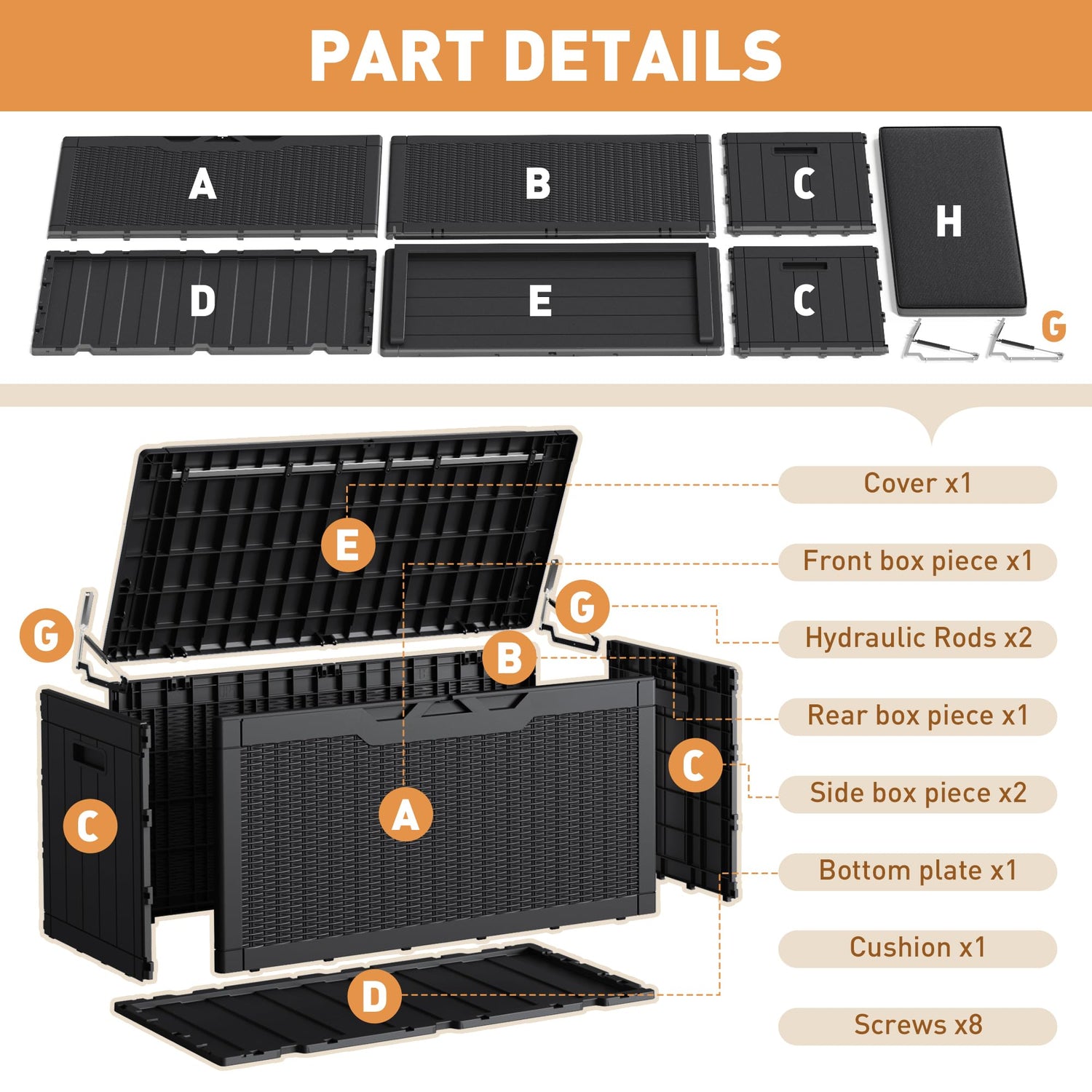 - PRACTICAL DESIGN: The deck box has a hydraulic holder design, which can prevent your hand from being caught when you open and close the box to ensure safety. Meanwhile, there is a support bar designed inside the lid, which can enhance the durability of the storage box.