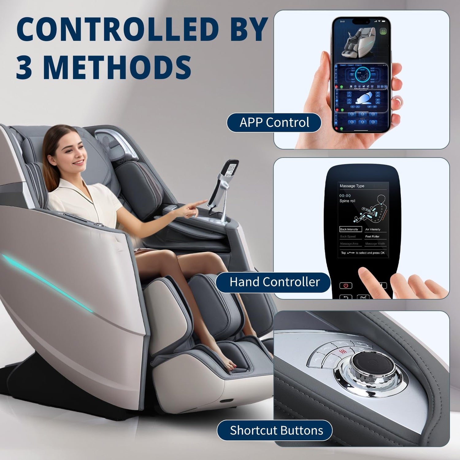- 【55" S+L Track】 Based on human ergonomics and research on different body curves, a new generation of hyperbolic rails has been developed to perfectly adapt to the neck, shoulders, back, waist, hips, and legs in all directions. With a dual V-massage robot, it enables closer and deeper massage of the entire body. Designed for unique massage experiences that combine gentle rubbing, stretching, and tapping.10 modes, 11 techniques, 40 airbag points all over the body, 3 levels of airbag pressure, compressing shoulders, arms, feet and buttocks, help relieve body pain.