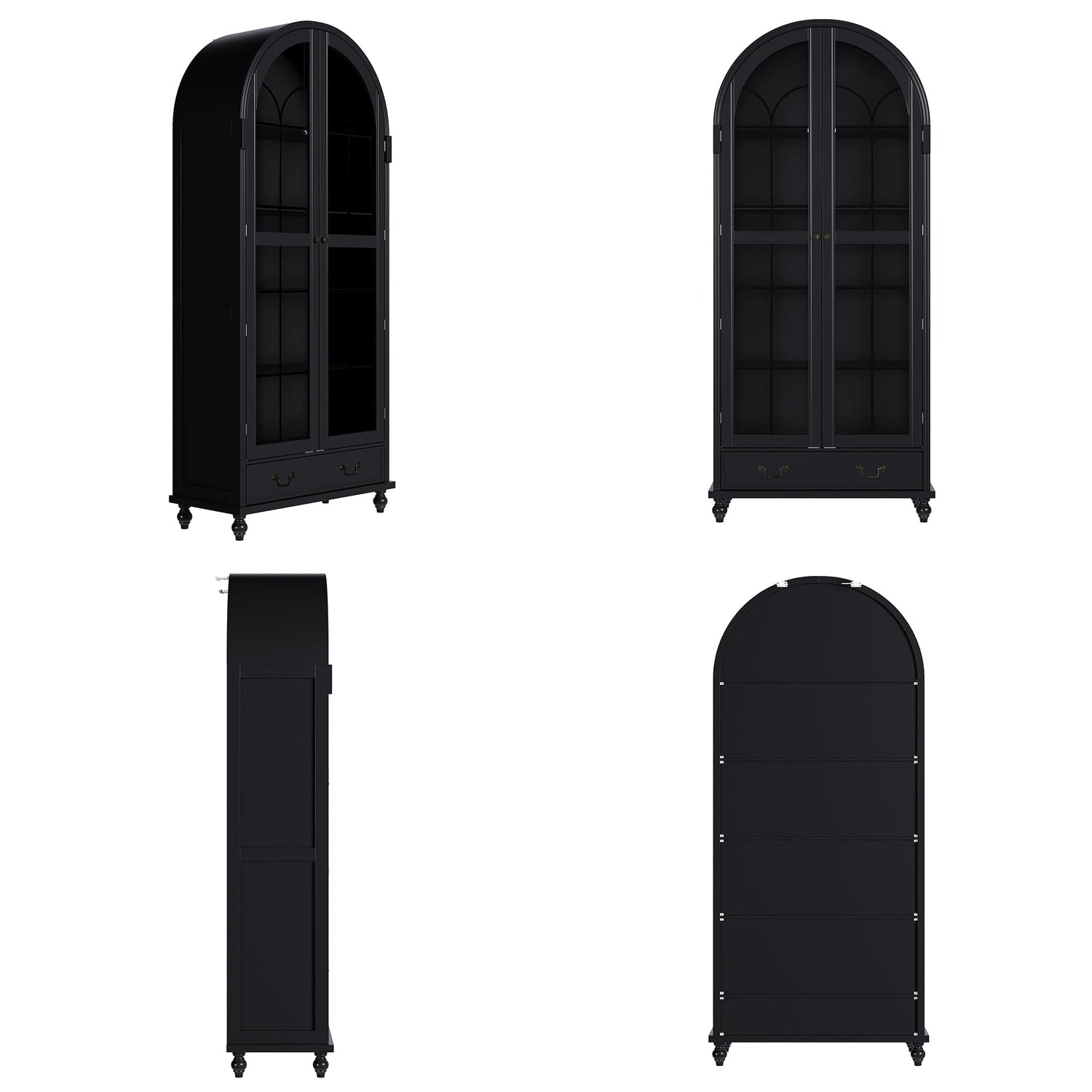 - Glass-Fronted Storage - This arched display cabinet blends form and function. Behind its clear glass doors lie five spacious shelves to display books, decorative objects, or collections. Adding further utility, one sturdy drawers is tucked away at the base, providing discreet and organized storage for smaller items