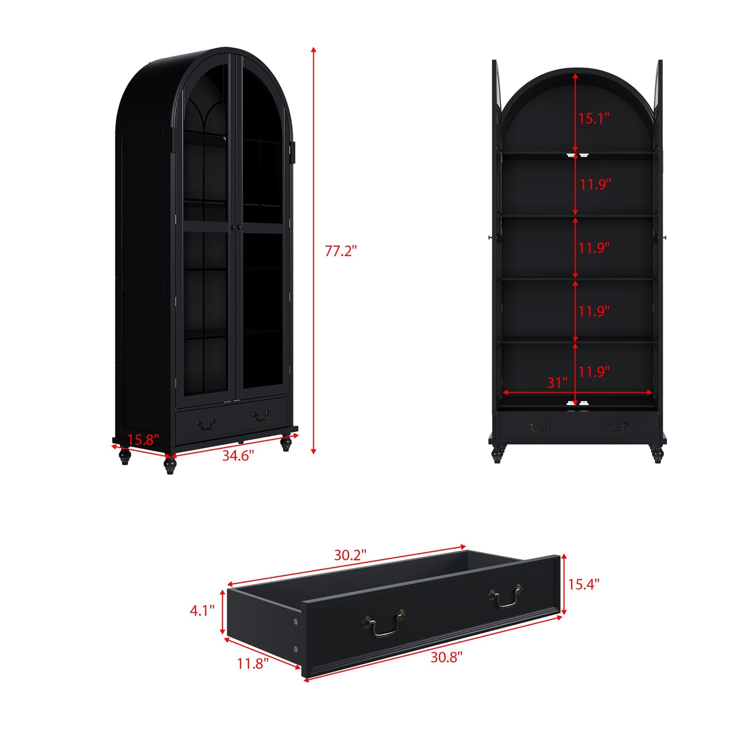 Details: Hitow Curio Cabinet with Glass Doors, Arched Display Cabinet with Drawers & Solid Pine Legs, 34.6"W Arch Bookcase, 5-Tier Black Display Case for Collectibles, Living Room