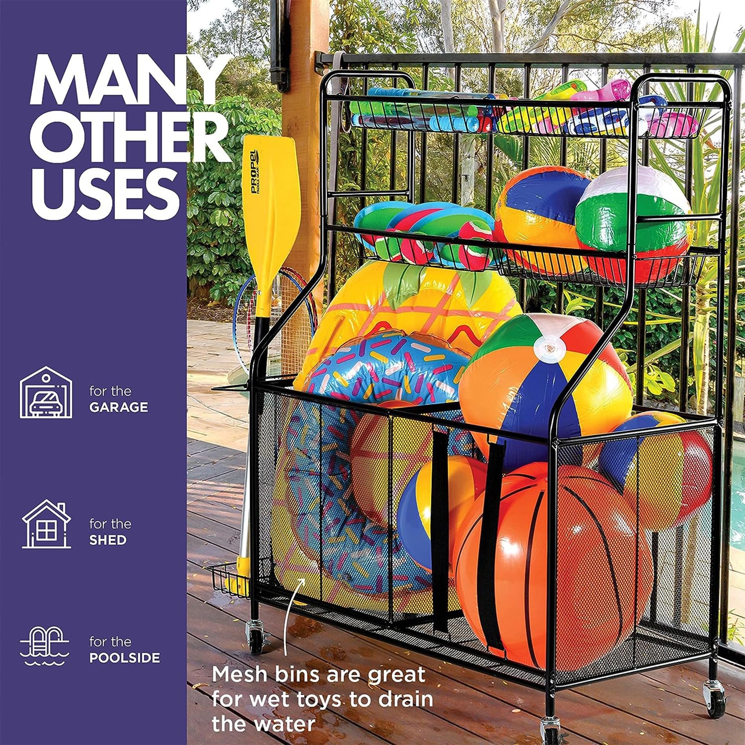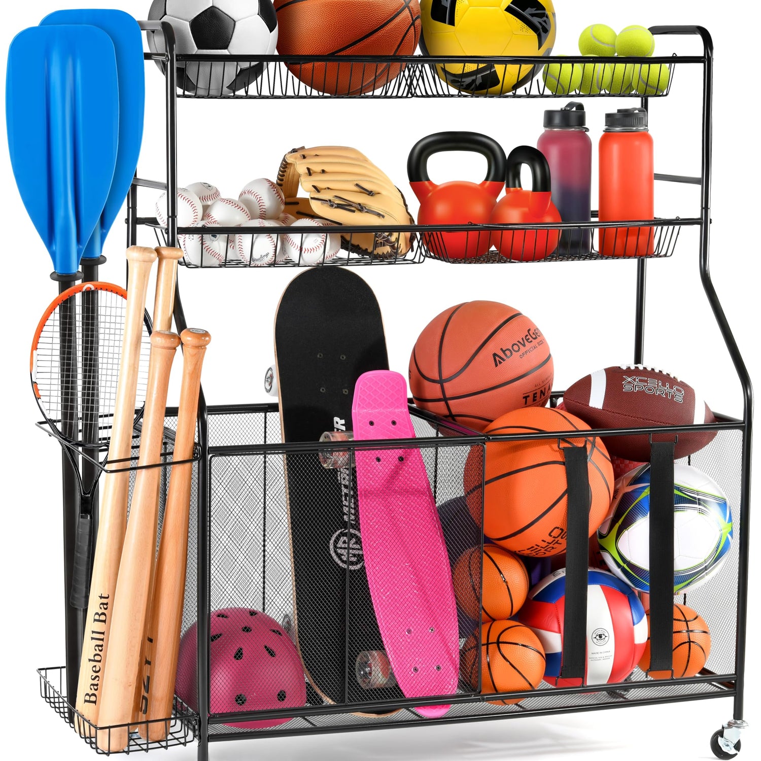 - Designed for Convenience - Four heavy-duty 360° swivel wheels with brakes make this storage for sports equipment easy to move. With 2 elastic straps, getting supplies at the bottom won't be a problem.