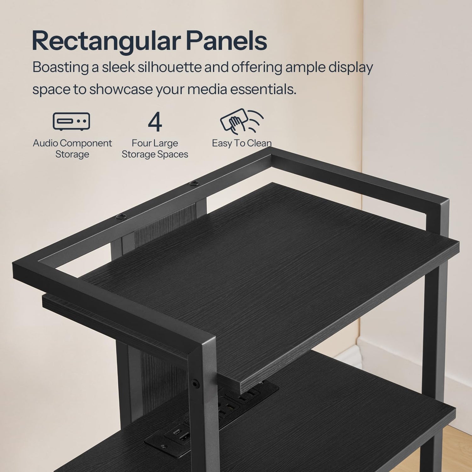 HOOBRO 4-Tier AV Media Console With Charging Station and LED Light, Wooden Stereo Cabinet, Corner TV Stand, Record Player, Entertainment Device, Black BB38UDCJ01