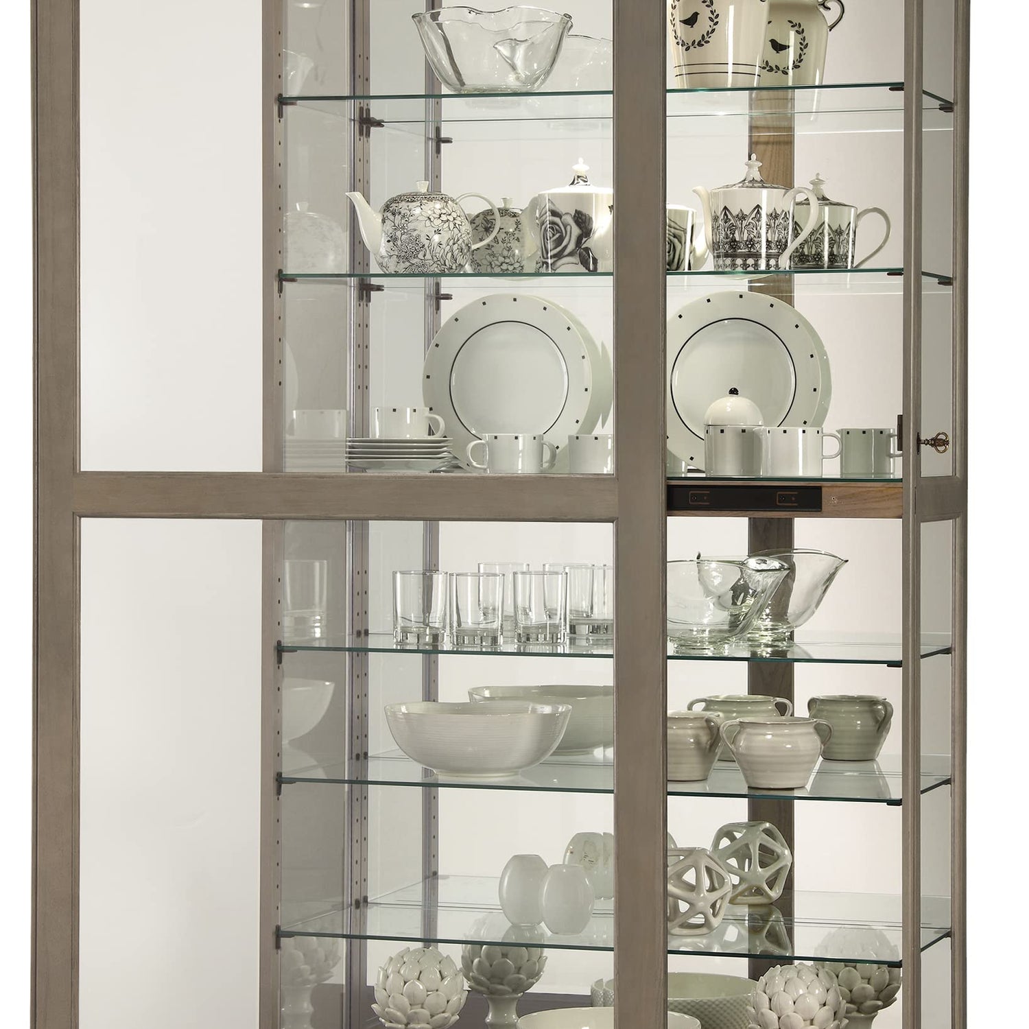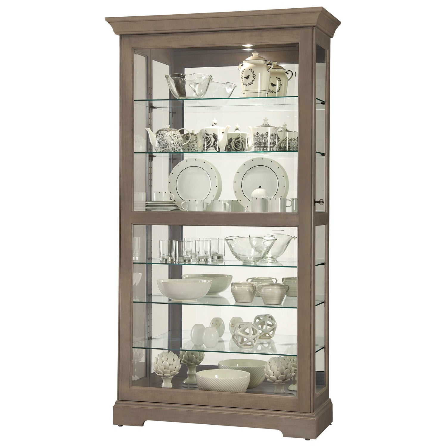 - SLEEK AESTHETIC: The Howard Miller Gilman Curio Cabinet II features a sophisticated Grey finish, seamlessly blending with any decor. Its elegant design, complemented by beveled glass, enhances your space while protecting your cherished items from dust & damage. This cabinet becomes a stunning focal point, perfect for showcasing collectibles in style.