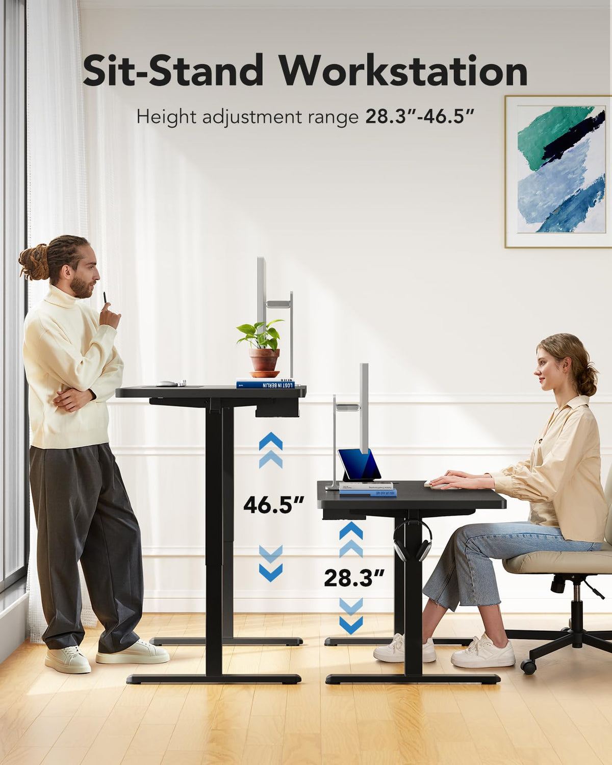 - 【Seamless Height Adjustable Sit-to-Stand】The adjustable computer desk can be smoothly adjusted from 27.9″ to 46.5″ in height, allowing you to choose the perfect level for sitting or standing. 4 memory preset buttons make this height adjustable standing desk easy to transition between your favorite heights throughout the day.