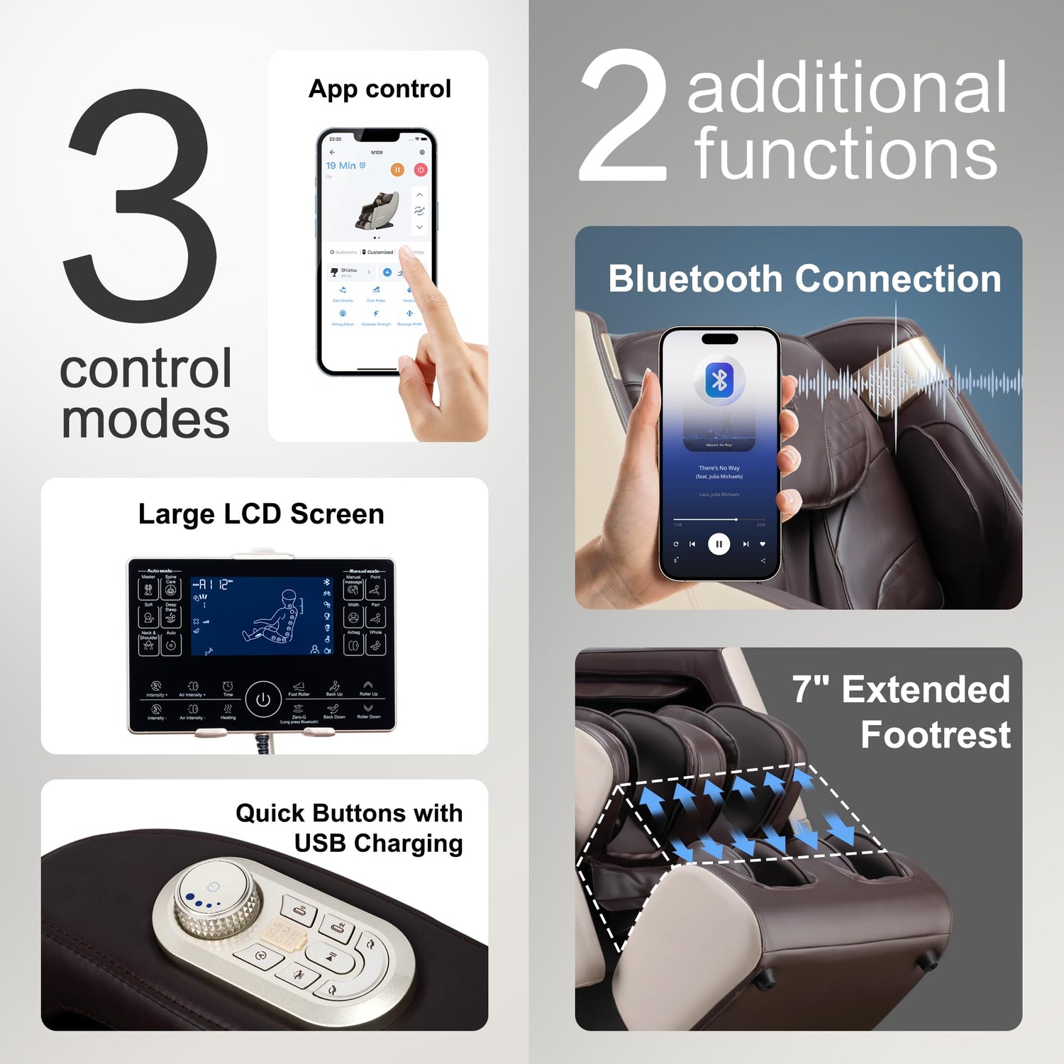 - ๐๐ซ๐๐ฆ๐ข๐ฎ๐ฆ ๐๐๐ฌ๐ฌ๐๐ ๐ ๐๐ก๐๐ข๐ซ ๐ ๐ฎ๐ฅ๐ฅ ๐๐จ๐๐ฒ: Operate this massage chair full body and recliner with your phone, the LCD screen, or quick-side buttons. For added convenience, a USB port keeps your phone charged. Enhance the experience by activating the calming mood lights and connecting to the Bluetooth speakers, turning your session into a multi-sensory treat