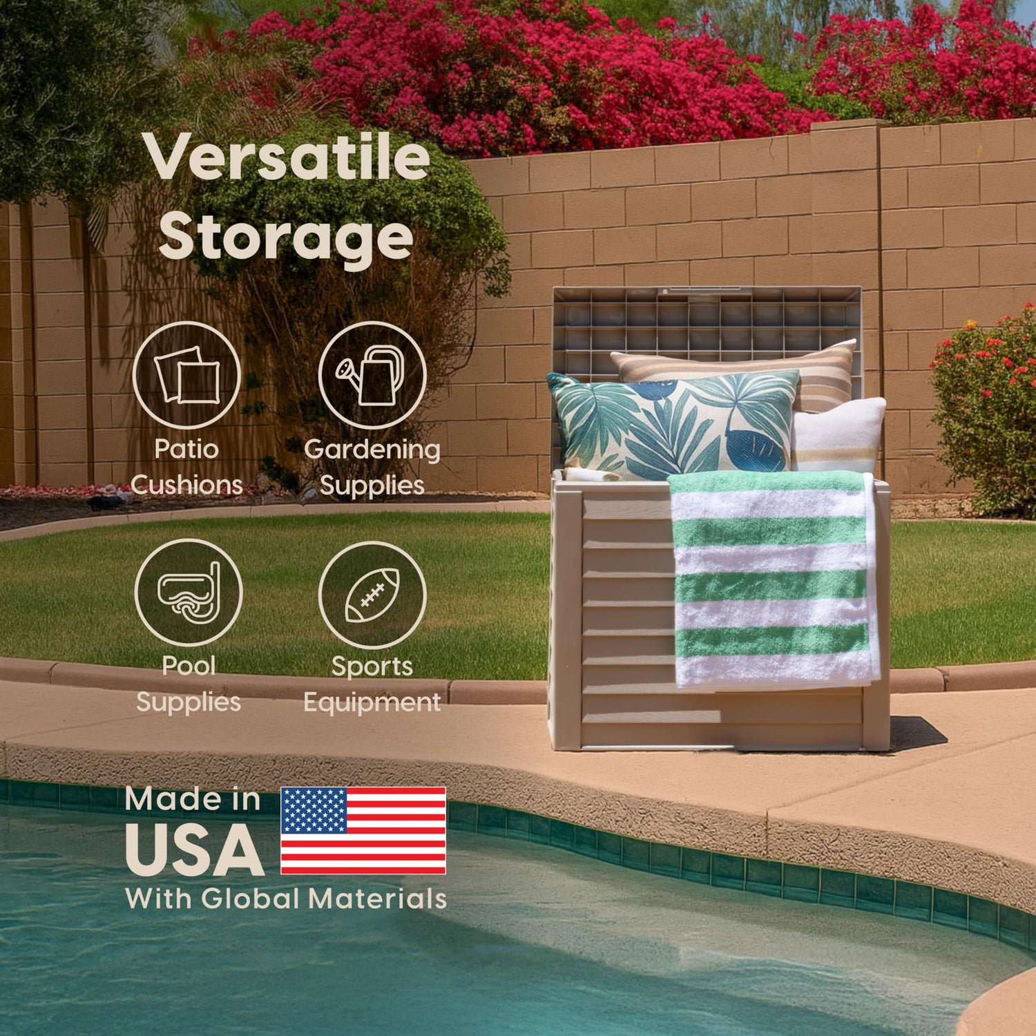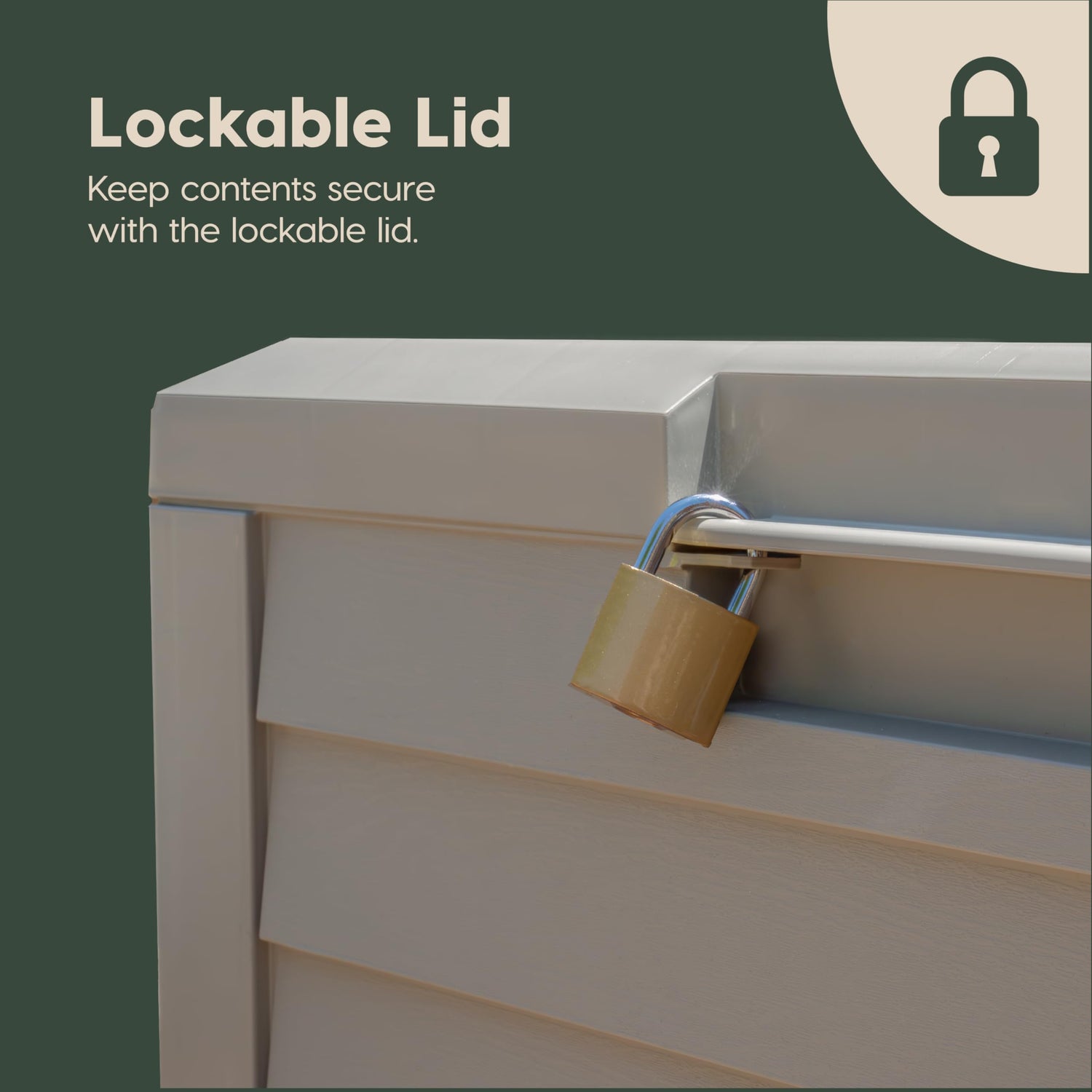 Details: Enhance your outdoor living space with our Beige 35-Gallon Outdoor Deck Box. With a spacious 35-gallon capacity, it’s perfect for storing cushions, garden tools, pool accessories, toys, and more. The padlock hole adds security, ensuring your belongings stay safe. Made from durable, weather-resistant resin, this box includes an ultraviolet (UV) agent to protect it from sun exposure, preventing fading or cracking. Easy-to-assemble panels (lid, front, rear, bottom, and two sides) make setup quick and hassle-free. The sleek beige color and wood-like texture blend seamlessly with any outdoor decor, whether placed on your patio, deck, or in your garden. This versatile box can also serve as a bench or side table, providing extra seating and utility. Keep your outdoor space organized and protected with this durable, UV-resistant outdoor deck box – a practical addition to your home!
