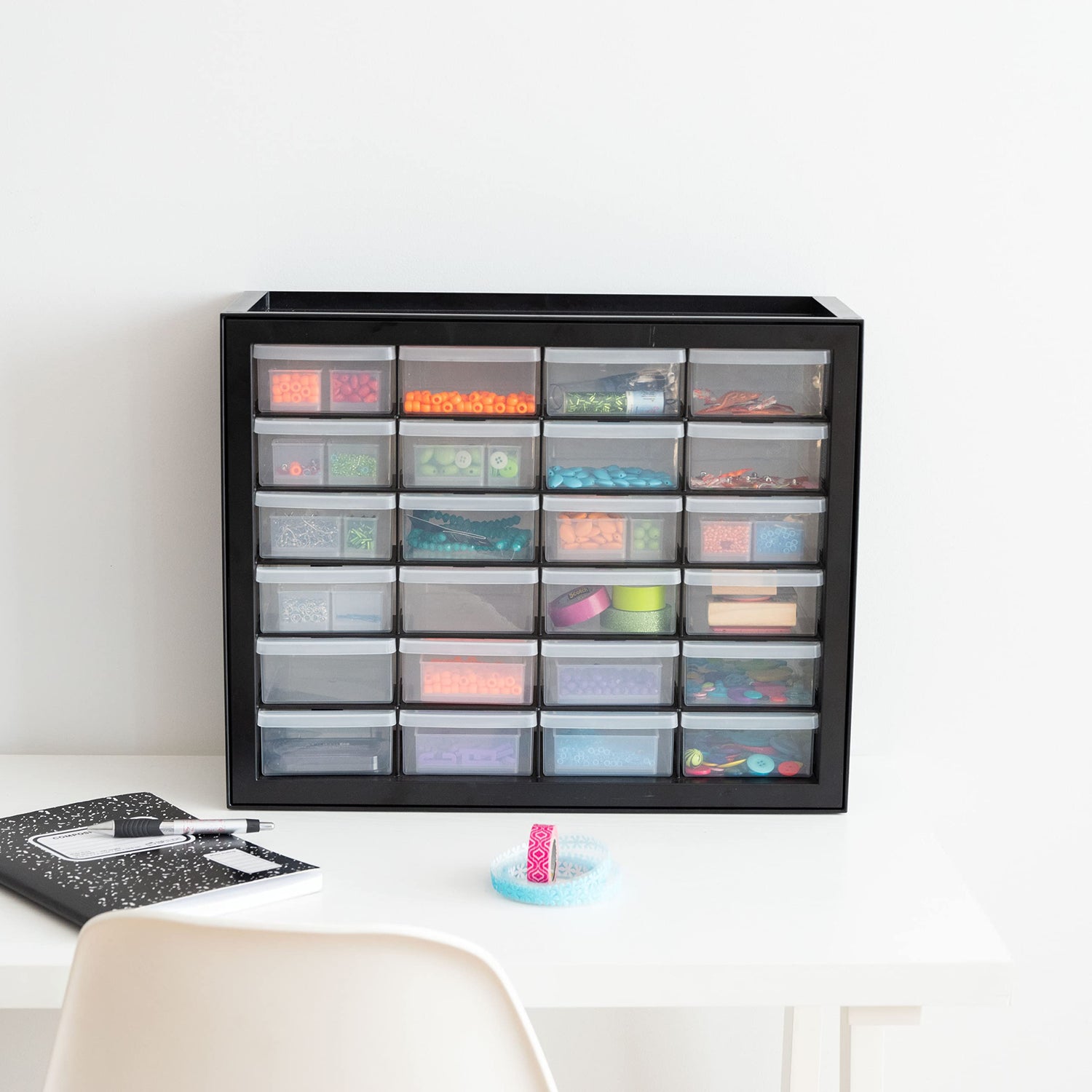 IRIS USA Plastic Storage Drawers, 24-Drawer, Stackable Small Parts Organizer Cabinet for Hardware Screw Nuts and Bolts Sticker Bead Balloon Building Bricks, Teacher Toolbox Garage Storage Bins, Black