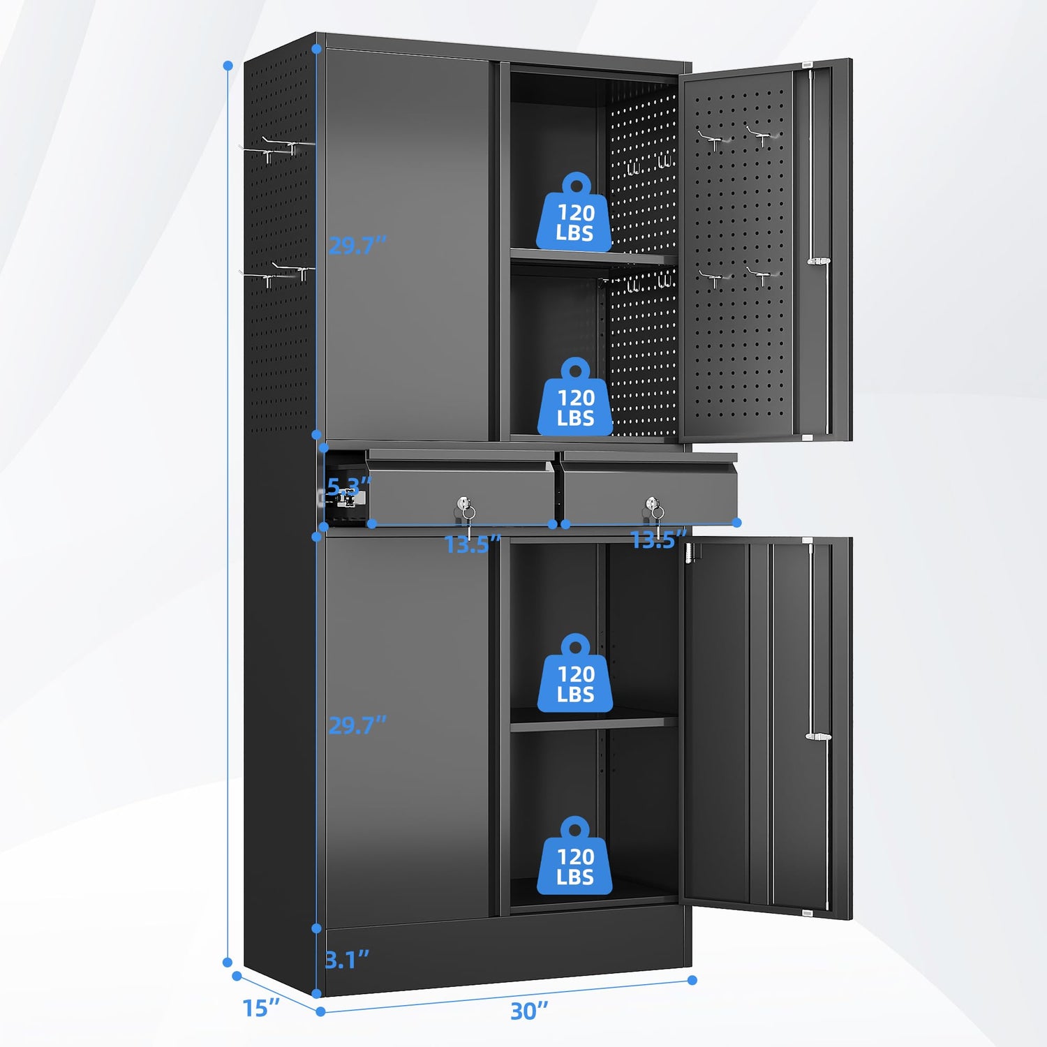 - Generous Dimensions & Versatile Features: With dimensions of 71"H x 30"W x 15"D, this garage storage cabinet offers ample storage space to meet your diverse needs. It comes with 2 adjustable shelves, allowing you to customize the interior layout according to the size and shape of your items. The multifunctional pegboard provides additional storage options, and it includes 8 hooks for hanging tools, keys, or other small accessories, maximizing the use of vertical space;