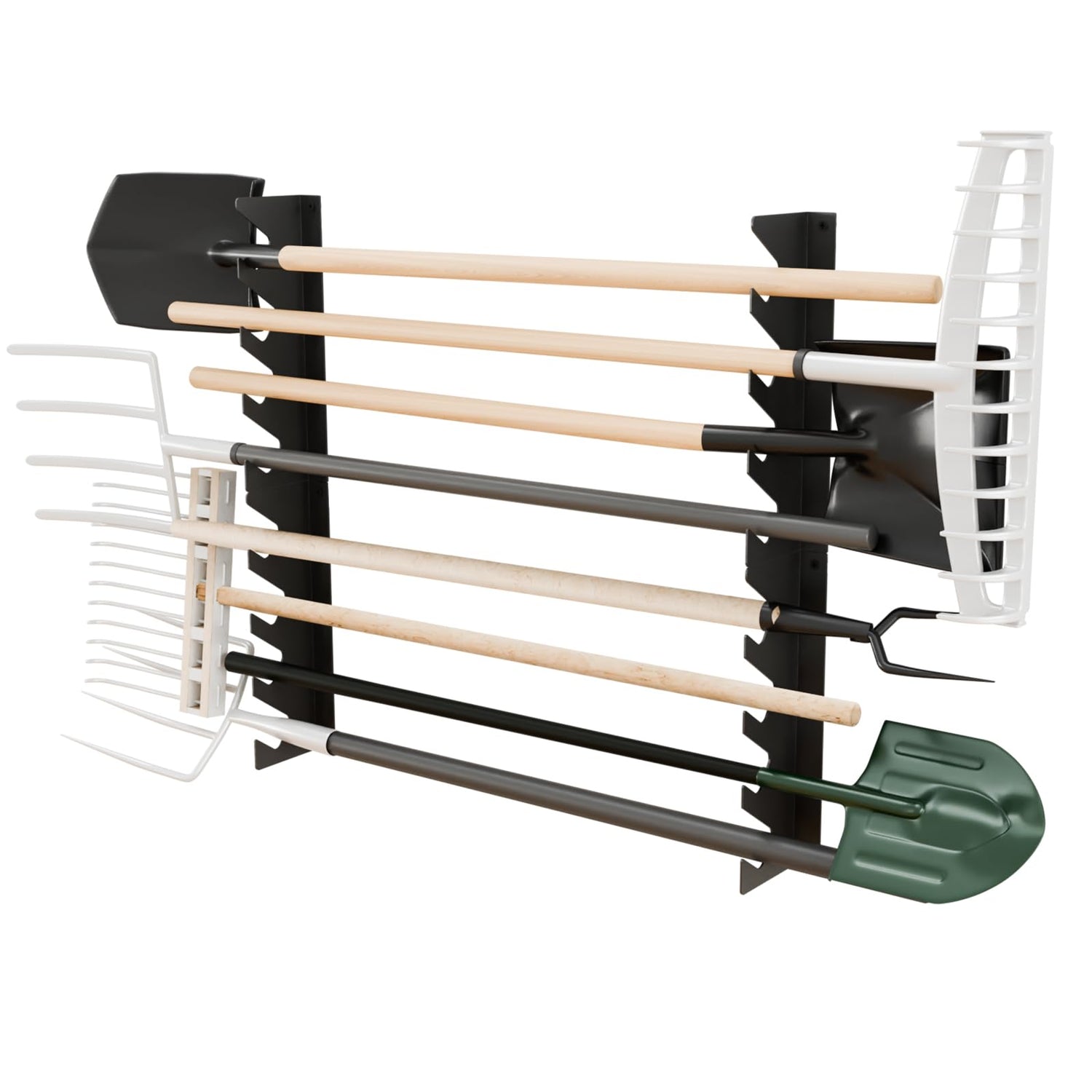 - Smart Storage Slots: Featuring four angled storage channels with an offset design, this organizer prevents tools from clashing and tangling. The slots accommodate most long-handled garden tools for easy access and efficient organization
