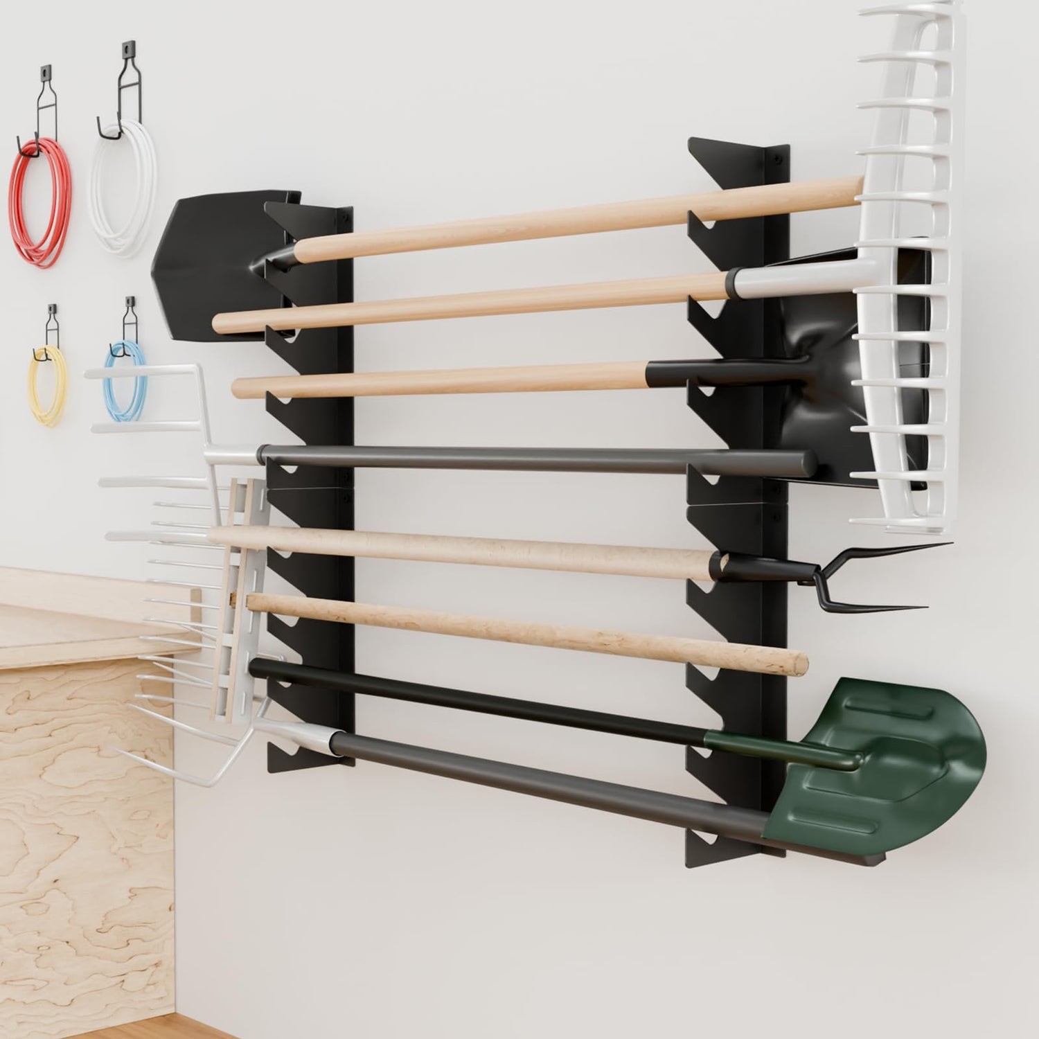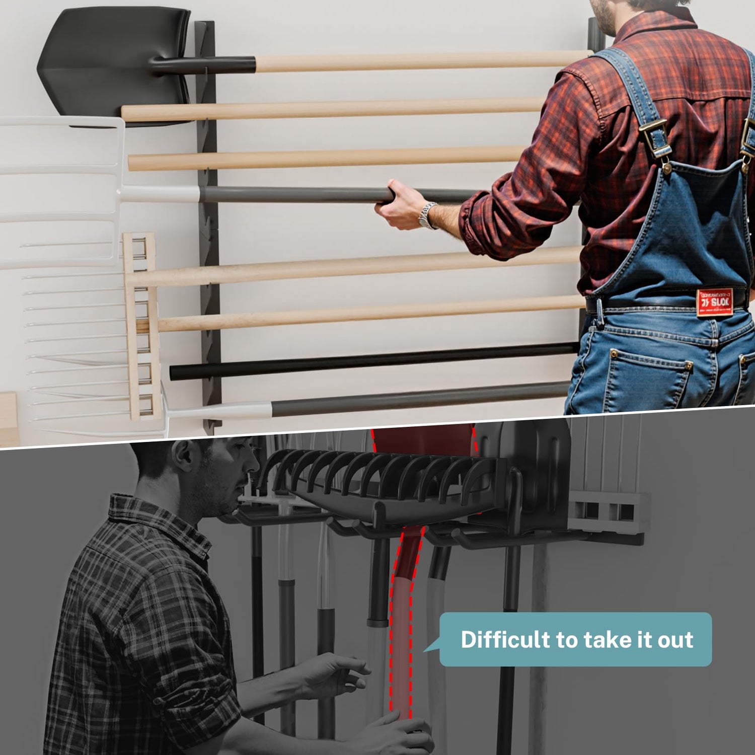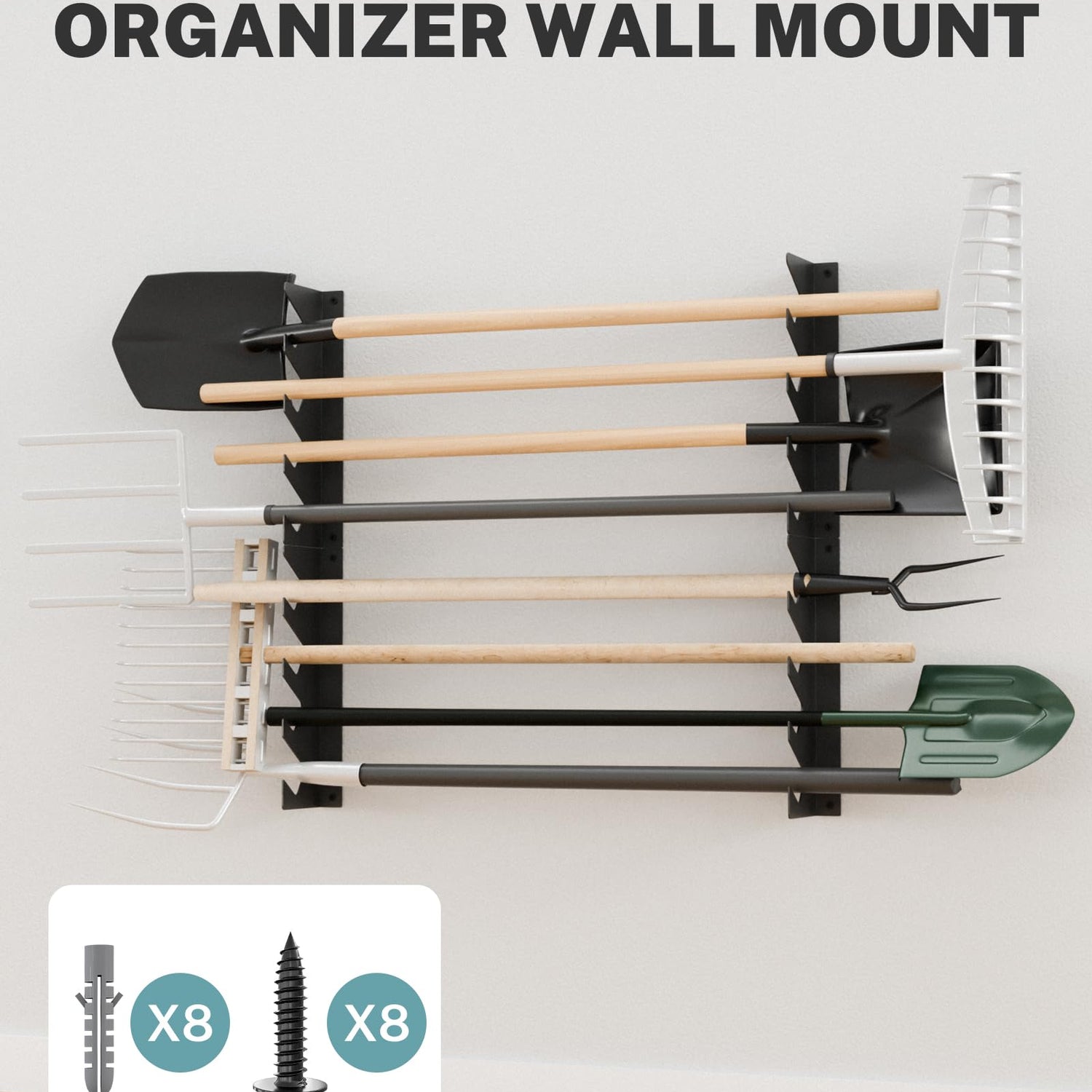 - Compact Space-Saving Design: Garage organizer keeps your shovels, rakes, brooms, and yard tools off the ground, promoting a tidy workspace while ensuring your tools remain in optimal condition and ready for your next project