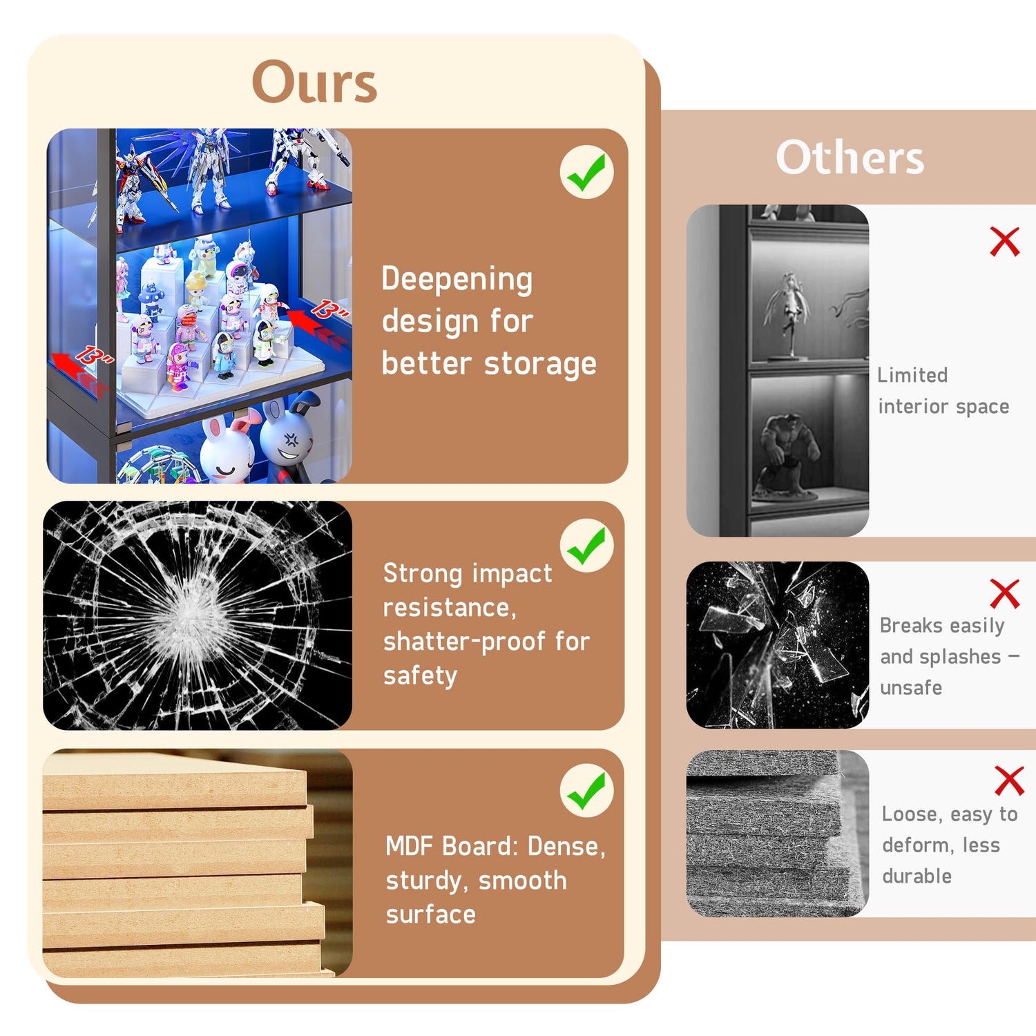 - Stable & Durable Design: Display case cabinet is constructed with MDF, acrylic panels. Anti-tip kit and corner guards ensure safe, stable support for your displays