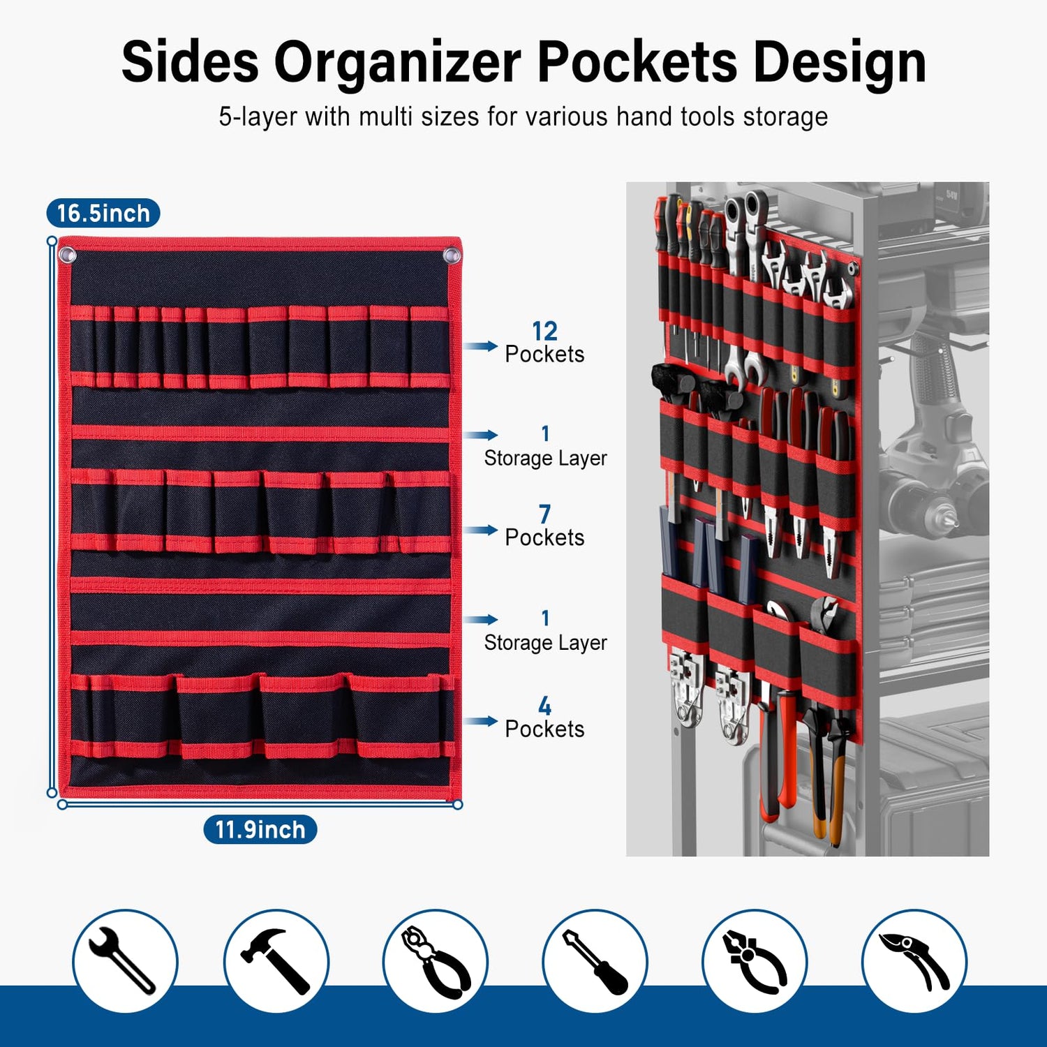 - All In One Power Tool Organizer Cart On Wheels: Our large power tool organizer with 8 outlets power strip includes 3 shelves and 1 drills holder layer, which can store up to 8 drills or be used as hooks. Sides organizer pockets design. 23 different sizes slots and 2 storage layers on each side maximize the storage space, can hold tools like forceps, screwdriver, wrench, scissors, hammer, etc. Innovatively equipped with 4 wheels for easily moving