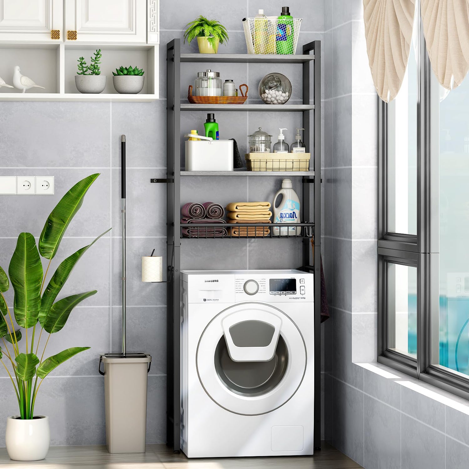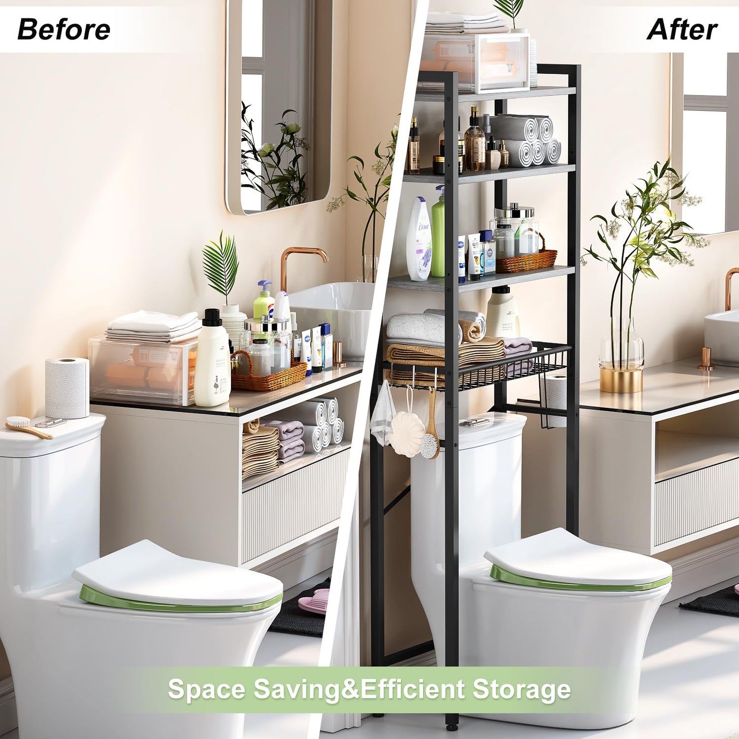 - [Utility Design] Our over the toilet storage shelf features three open shelves and 1 storage basket, along with 3 removable hooks and a toilet paper holder, providing ample storage space. The compartment below the basket helps organize your toilet, washing machine, dirty clothes cart, and other large items.