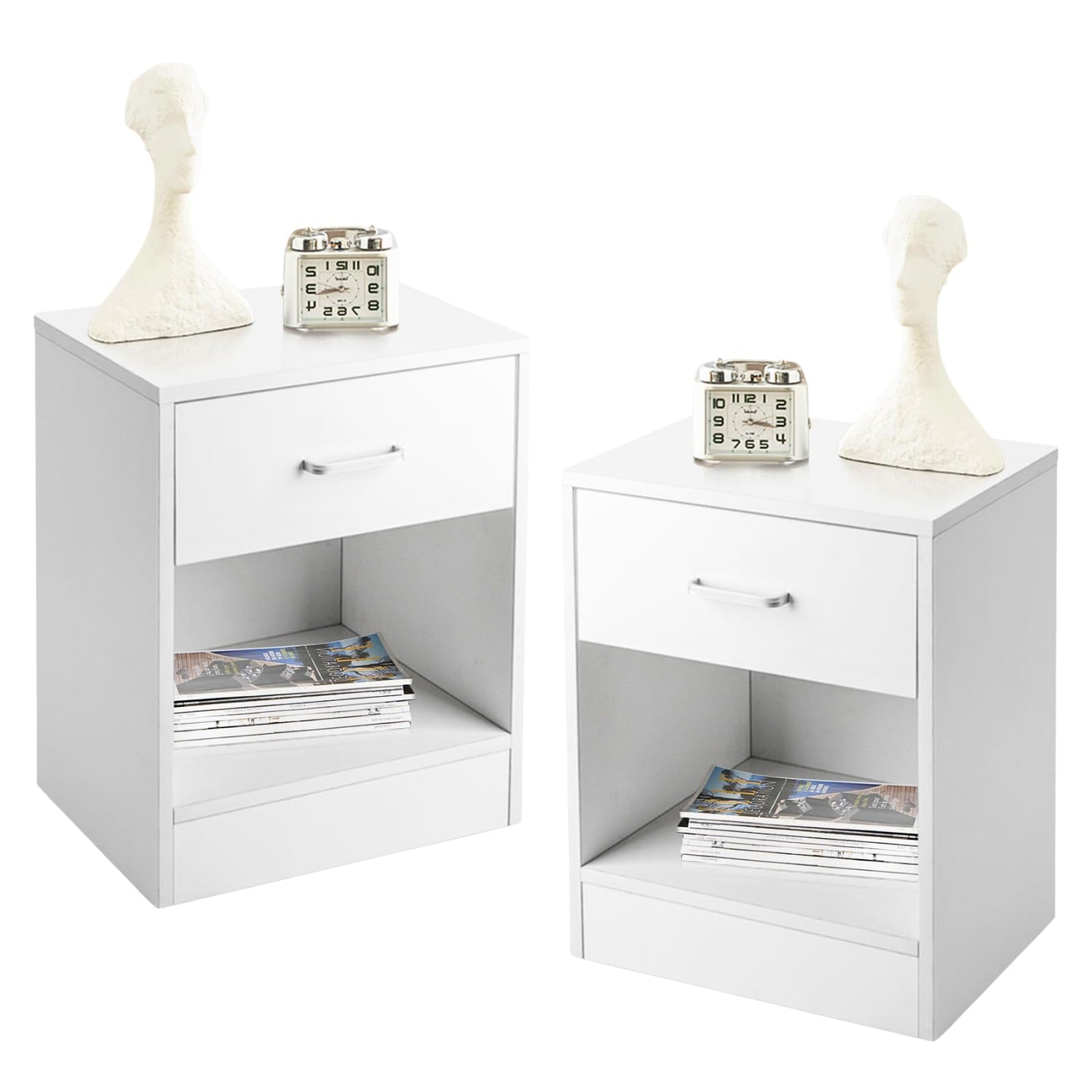 Karl home Nightstands Set of 2 with Drawer for Bedroom, Wood Night Stand Set 2 with Open Shelf, Modern Nightstand Bedside Tables Set of 2, End Table, White