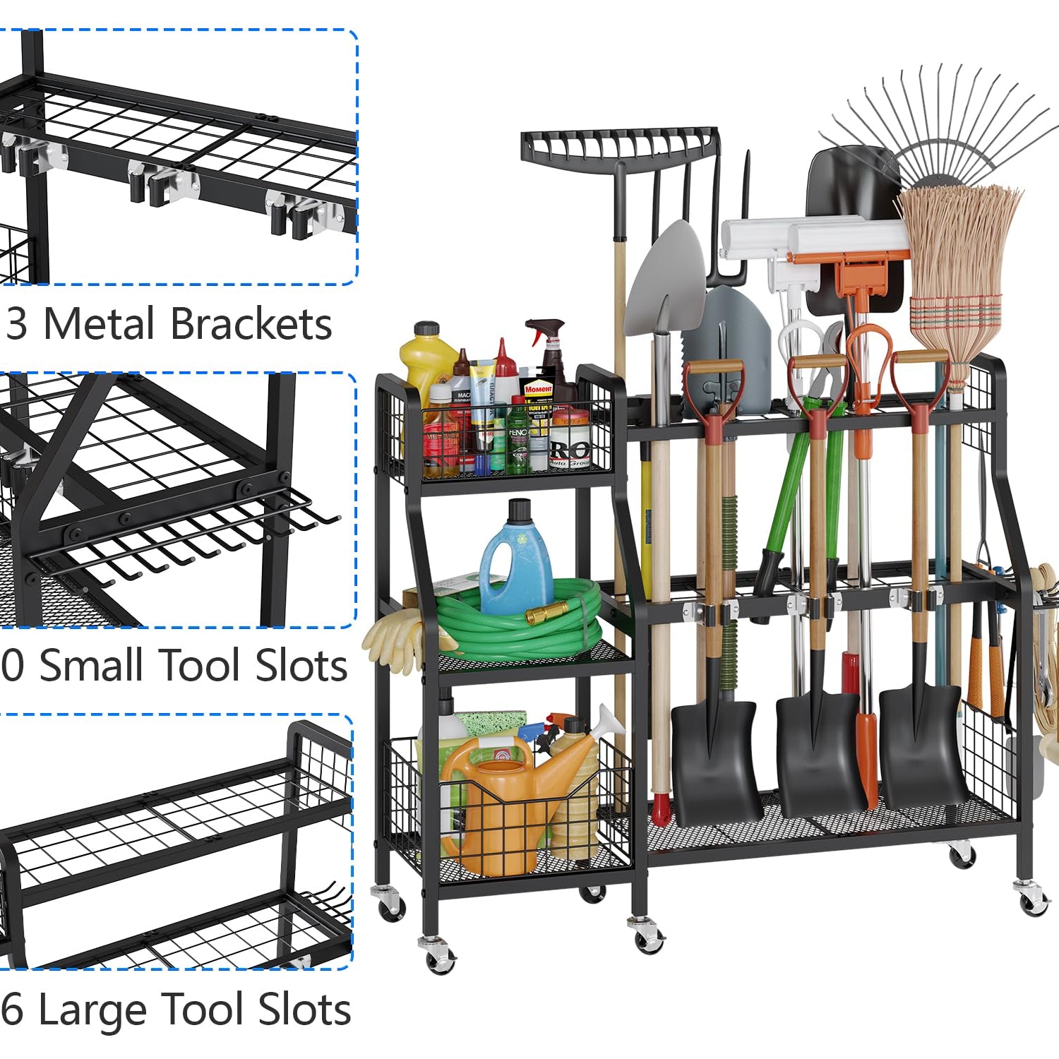 keomaisyto Garden Tool Organizer with 6 Wheels(3 lockable), Heavy Duty Yard Tool organizer with 2 Basket, Large Metal Garage Tool Organization and Storage for Garage/Shed/Yard/Broom Closet/Lawn
