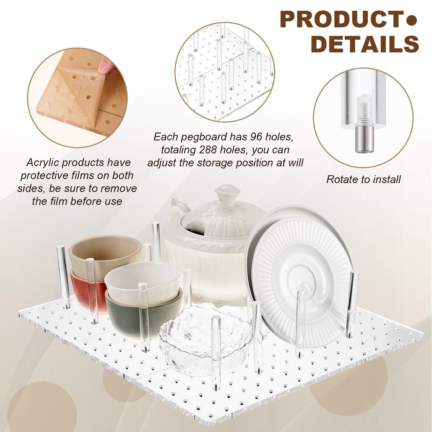 - Quality and Durability: experience outstanding durability with our clear pegboard drawer organizer; Crafted from the acrylic sheet, this peg drawer organizer ensures long lasting use; Its transparent color also adds a touch of elegance to your space; Acrylic products have protective films on both sides, be sure to remove the film before use