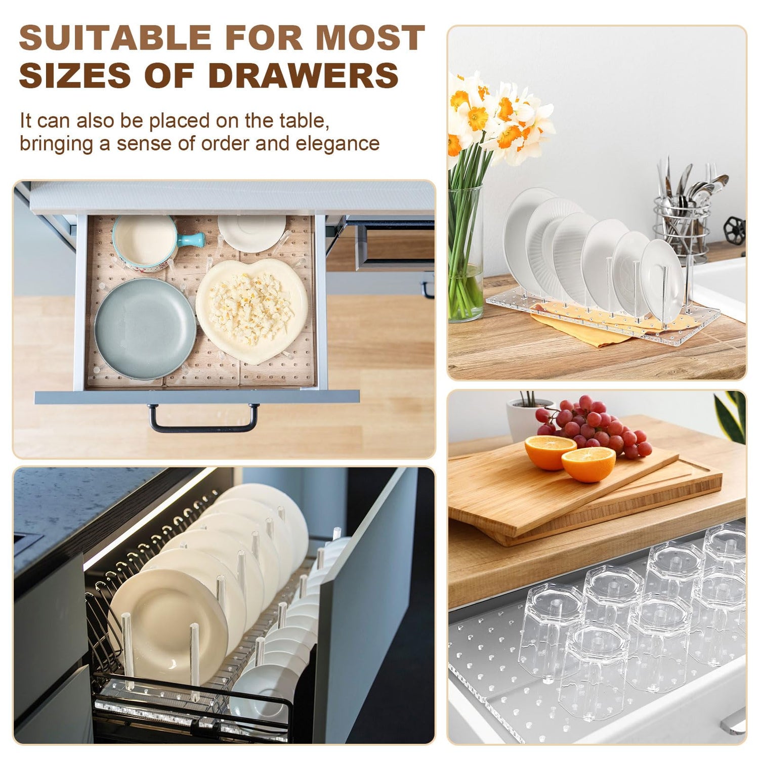 - Spacious and Flexible Design: enjoy the spacious design of this pegboard drawer organizer for dishes; Its dimensions of about 16 x 5.91 x 0.31 inches and the maximum size of about 17.72 x 16 inches accommodates dishware and kitchen utensils comfortably; The adjustability of the acrylic pegs ensures flexibility in organizing your items, making it an ideal drawer peg organizer; Please measure your drawer before ordering