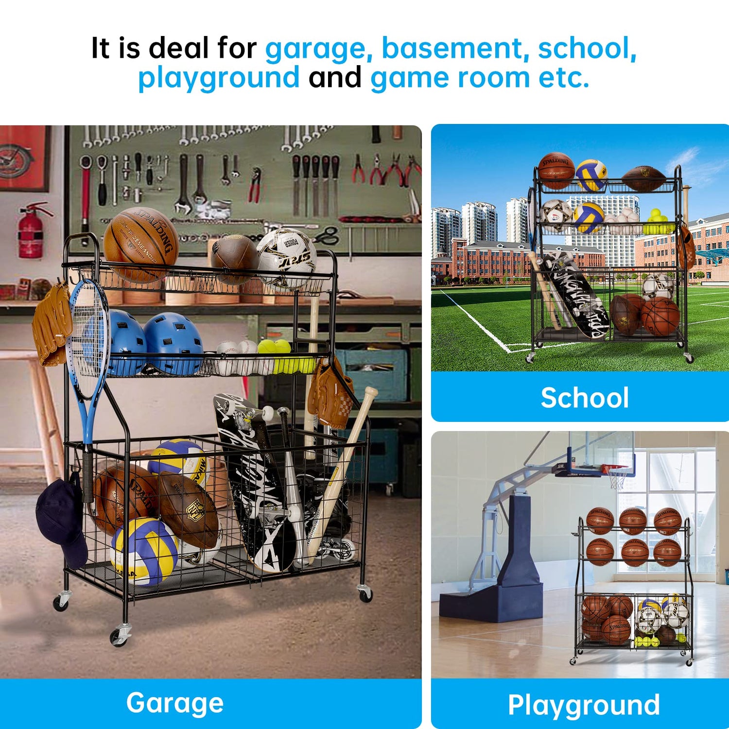 - BIG CAPACITY BASKETBALL RACK:The Rolling Sports Ball Basket features in 4 heavy-duty smooth rolling wheels, Indoor Outdoor Design, which is easy to move the organizer anywhere and fits in a specific position.It is ideal for the garage, home, Storage room, playroom, gym, playgroup and schools