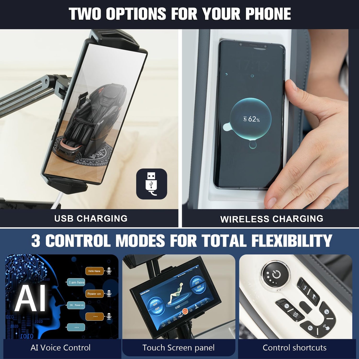 - Bluetooth Joystick & Phone Mount for Hands-Free Scrolling: Control your phone effortlessly with the wireless joystick in this massage chair—flip videos, adjust volume, or read novels with just one finger; The 360° adjustable phone mount keeps your screen at eye level, so you never miss a moment of the action while enjoying a massage