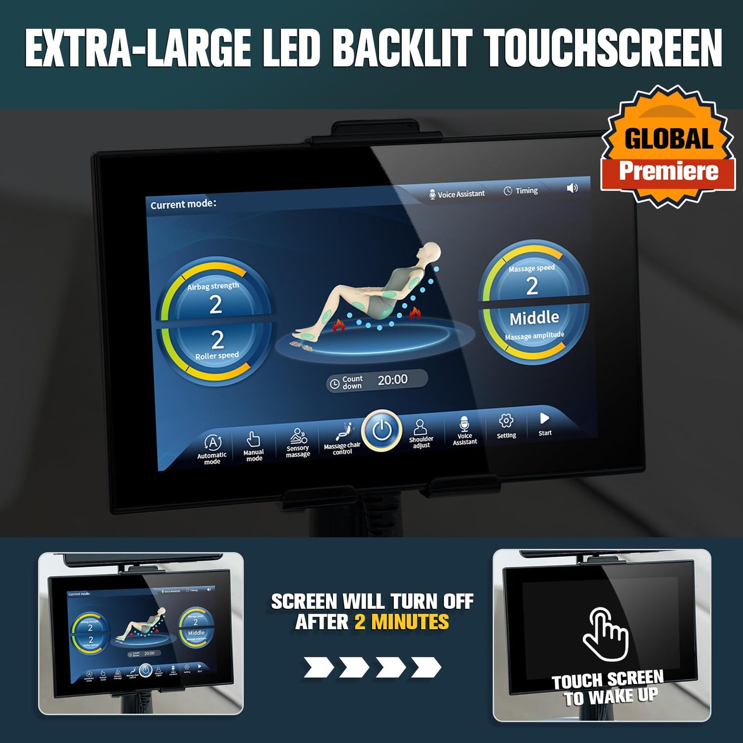 - LED Backlit Touchscreen & Ambient Mood Lighting: Operate the massage chairs full body and recliner even in low light with the ultra-clear LED touchscreen; Blue ambient lights on the chair sides create a calming spa vibe, perfect for late-night relaxation sessions