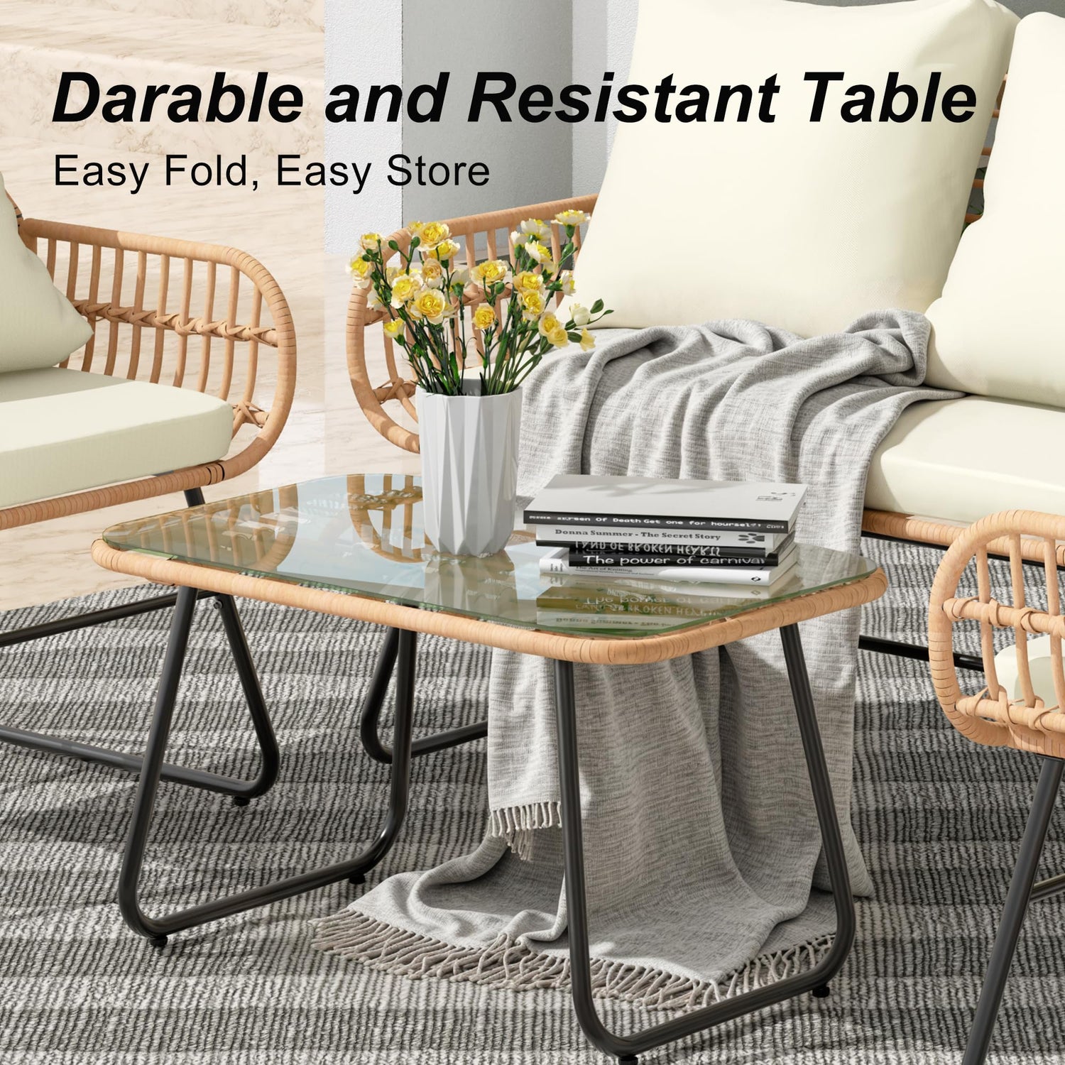 LEX CRAFT 4-Piece Outdoor Patio Furniture Set with Cushions & Tempered Glass Table, All-Weather Rattan Bistro Set with Loveseat Chairs Table Soft Cushions for Garden, Porch, Backyard (Beige)