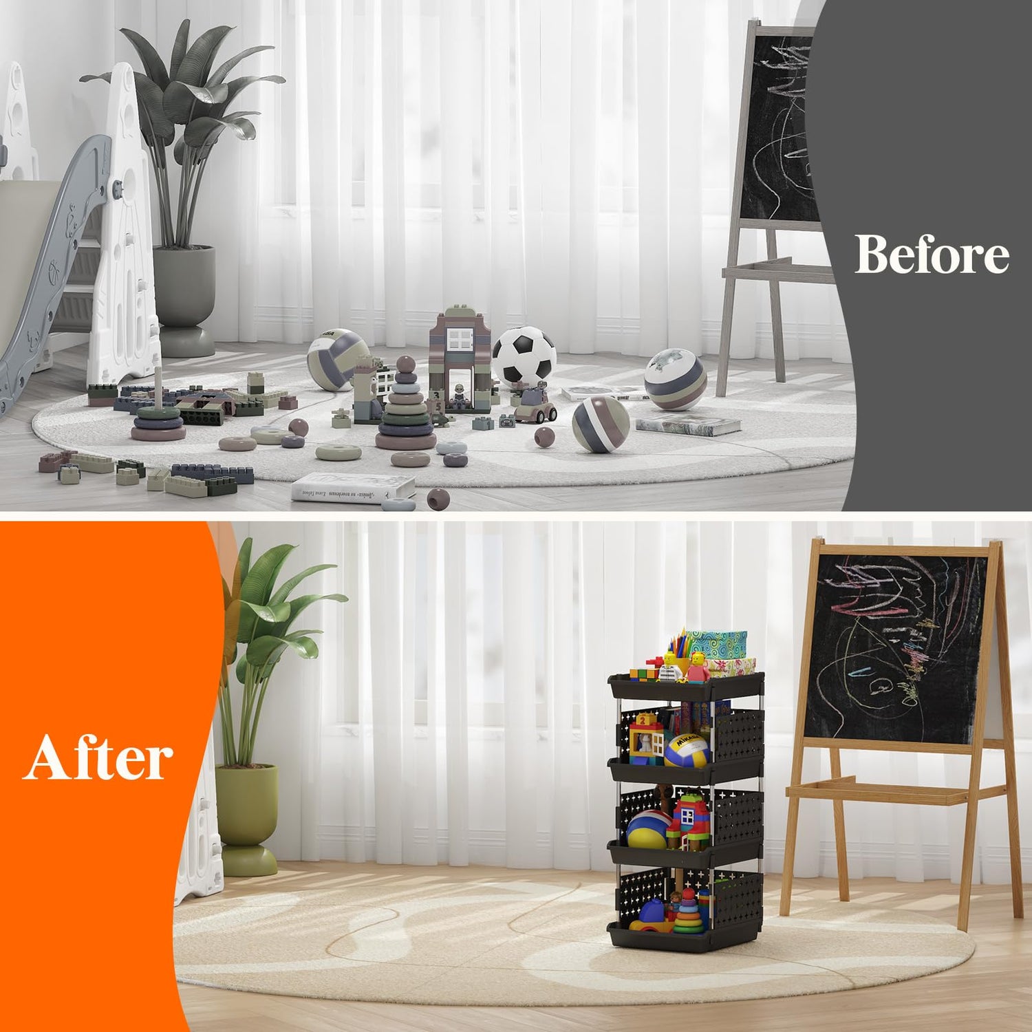 Lifewit Plastic Stackable Storage Baskets, 4 Tier Stacking Bins 13.8"D x 11.8"W x 28.3"H, Large Capacity Multi-Functional Containers Shelves for Pantry, Playroom, Kitchen and Bedroom, 1 Pack, Black