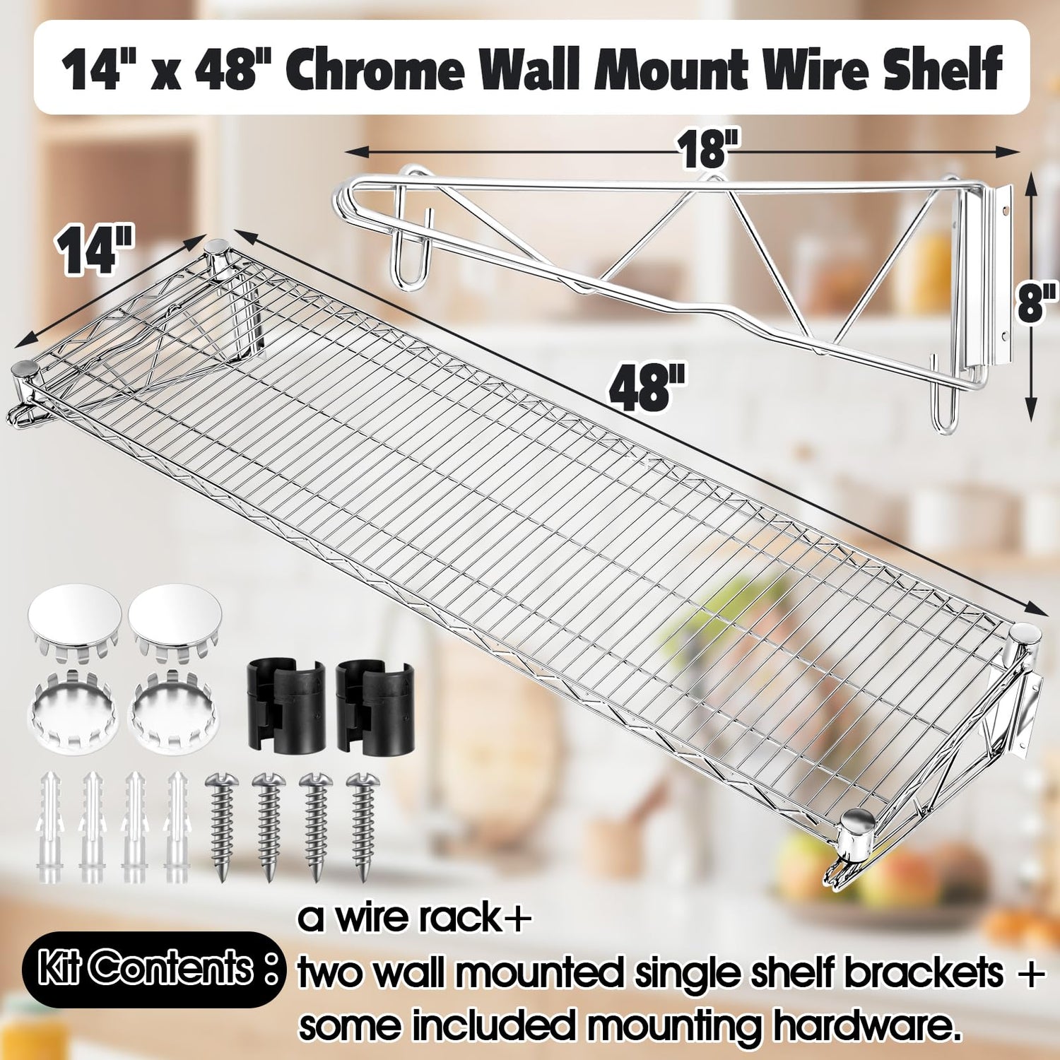 LOYIM 14" Wx 48" L Chrome Wire Wall Mount Shelf, Wall Mount Wire Shelf Kit Heavy Duty Garage Wall Shelving for Wall Storage, Holds Up to 600 Lbs