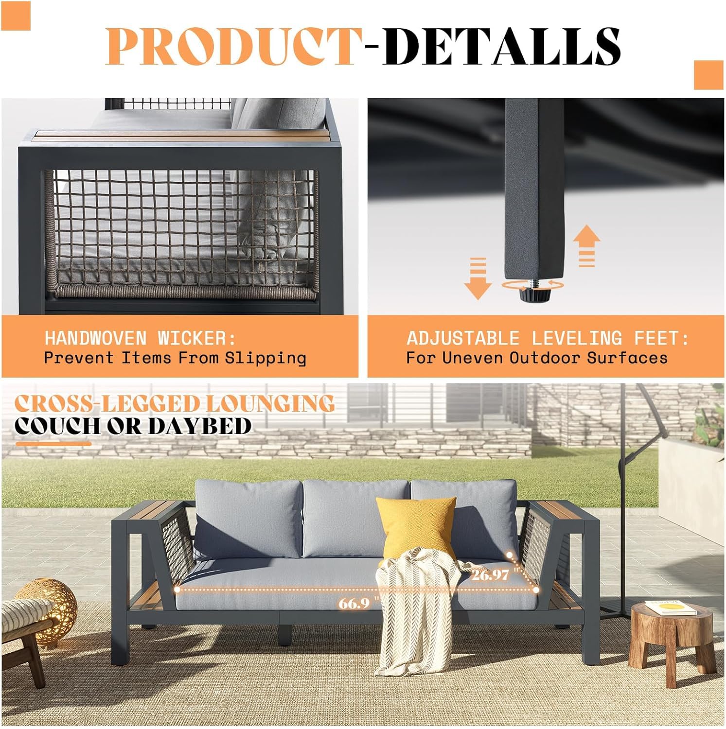 - 【All-in-One Outdoor Comfort】Transform your balcony or deck into a cozy retreat. Our 3-seat aluminum sofa includes integrated side table armrests—perfect for holding drinks, books, or plants.