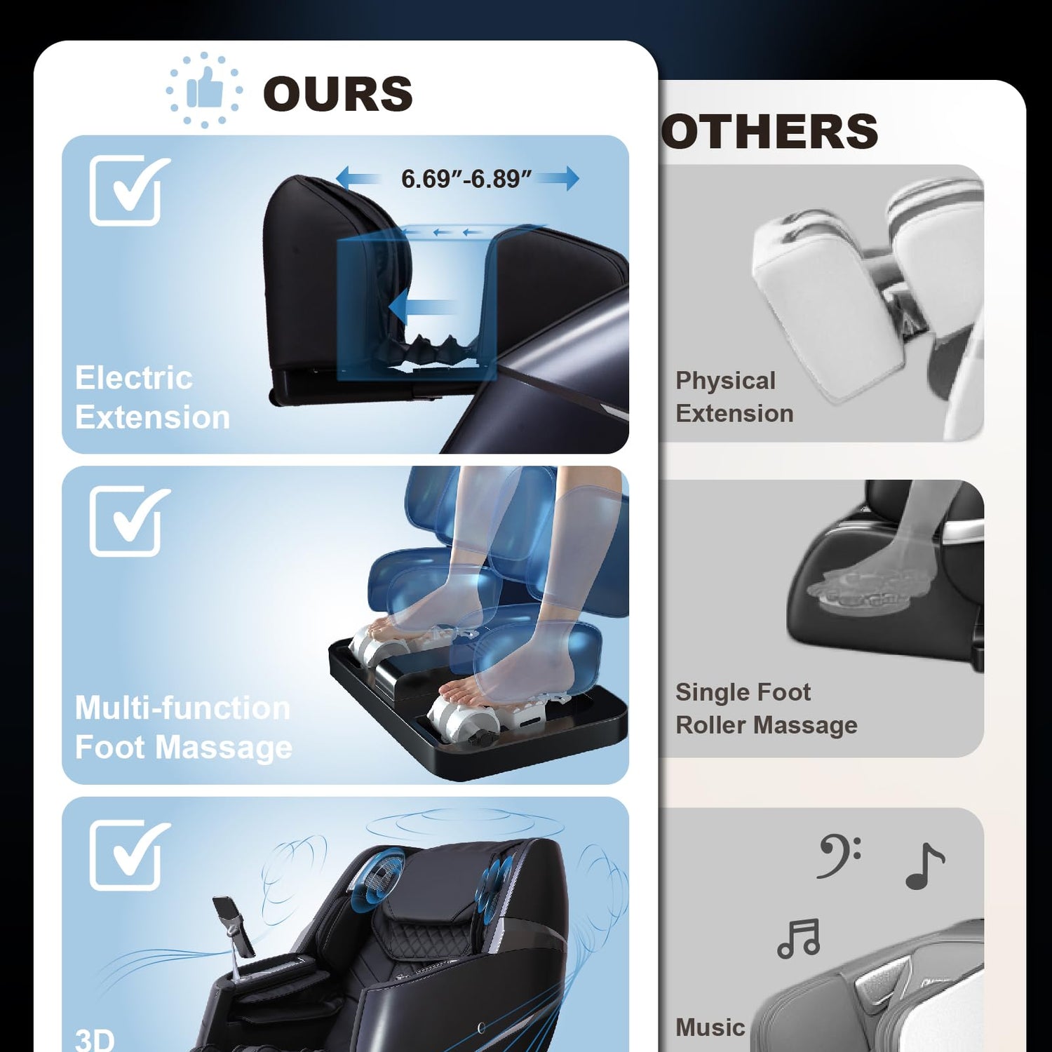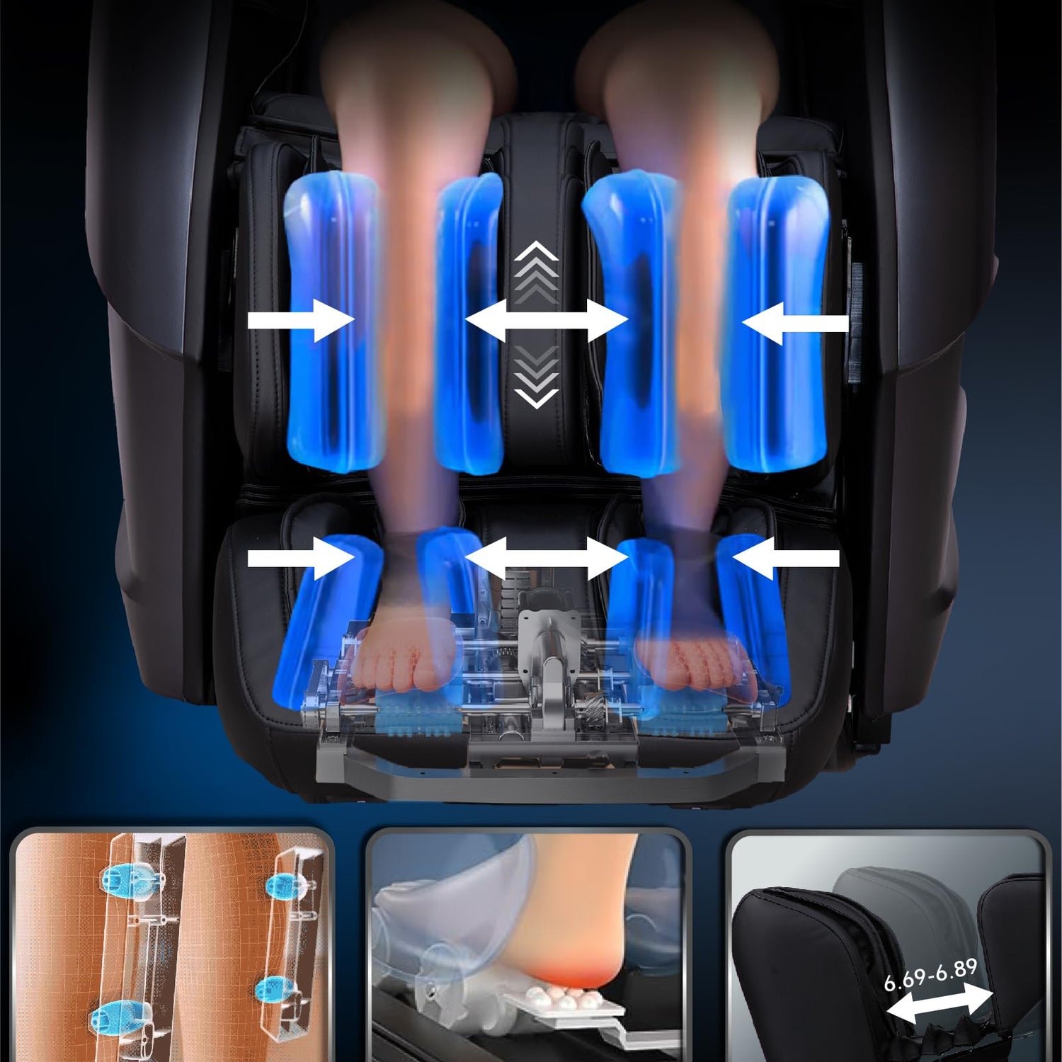 - Deep foot massage: The footrest extends by 6.89 inches, suitable for individuals of varying heights. It features three rows of foot rollers, providing a comprehensive massage from toes to heels. Additionally, there are calf roller massages and side airbag massages. Deep foot massage promotes relaxation, enhancing sleep quality