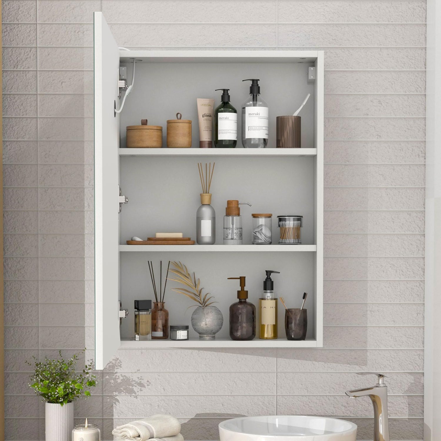 - 【Surface Mount Medicine Cabinets】This medicine cabinet with mirror can be surfaced. Equipped with US Plug Adapter. In addition, surface mount medicine cabinet for different bathroom designs. No need for electrician installation, direct use.