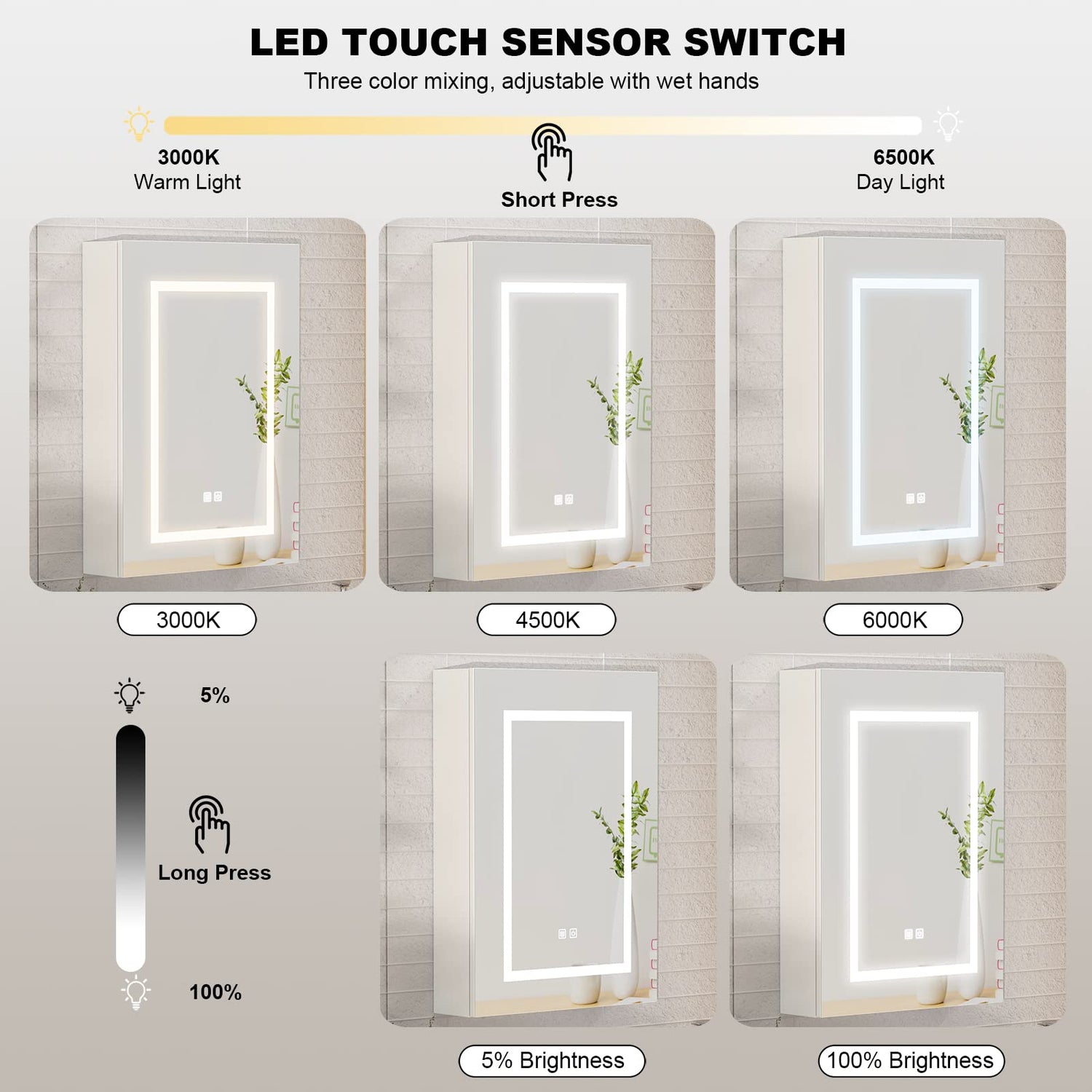 - 【Lighted Medicine Cabinet with Mirror】 This bathroom medicine cabinet has 2 smart touch sensor controls, one for the lighting adjustable ;Just click the LED sensor to operate the switch. Long press the button to adjust the intensity of the light, and short press to adjust the color of the light. There are 3 colors lights to choose from. Note: Led lights are only used as mood lights and cannot be used for lighting and cannot illuminate the entire bathroom.