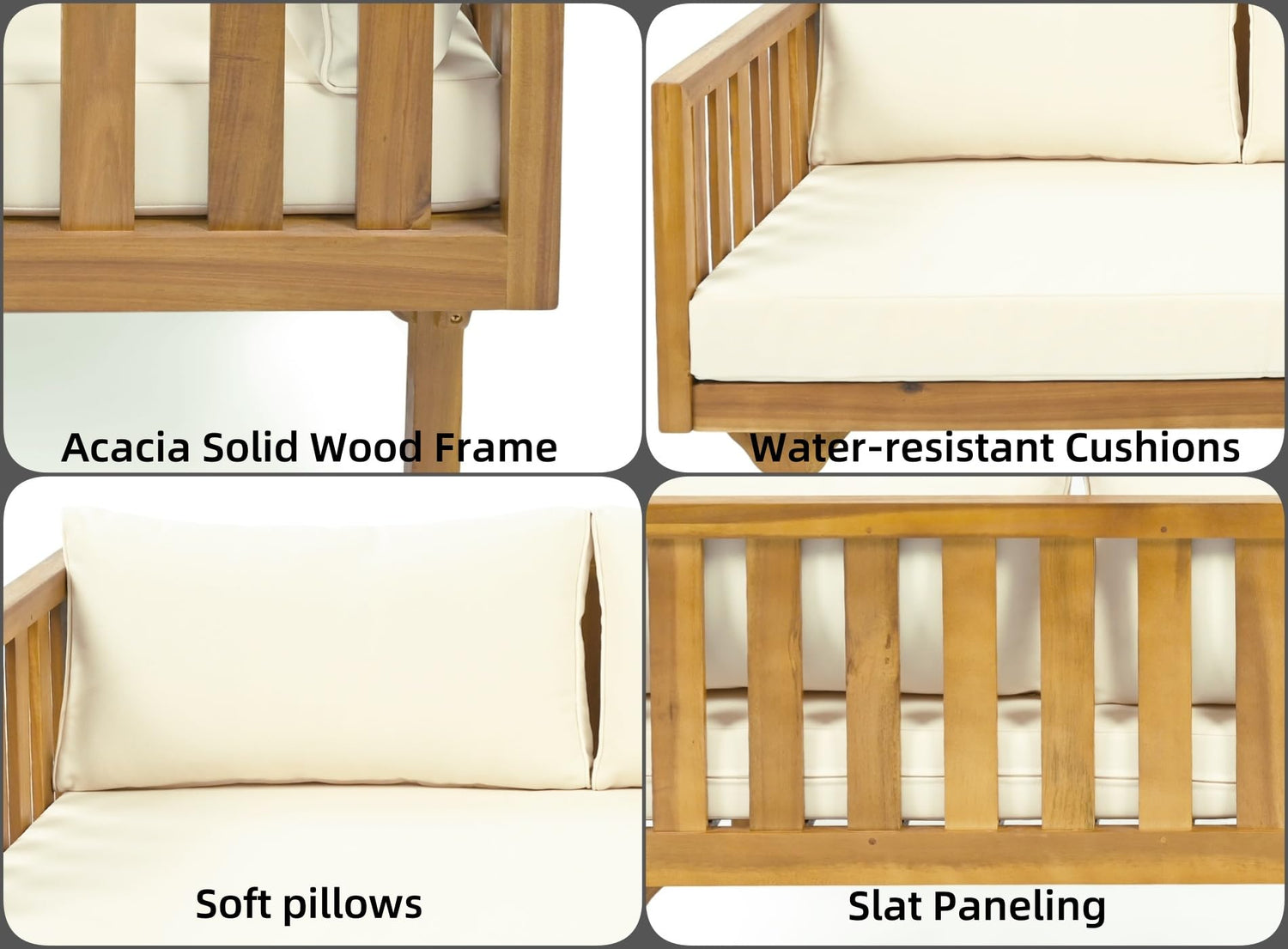 Merax Outdoor 3 Seater Daybed, Acacia Wood Day Bed Couch Sofa with Cushions for Patio Backyard, Garden, Beige