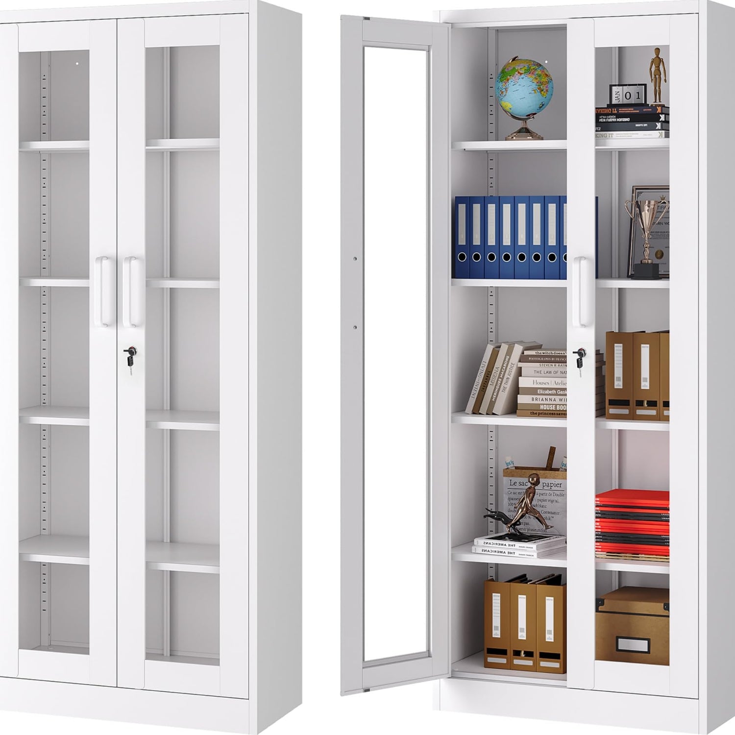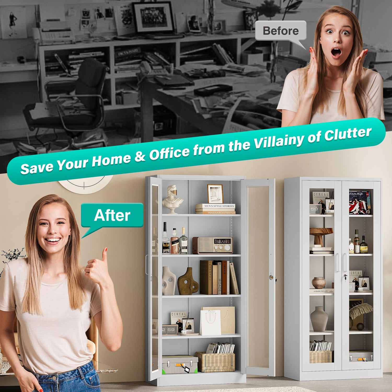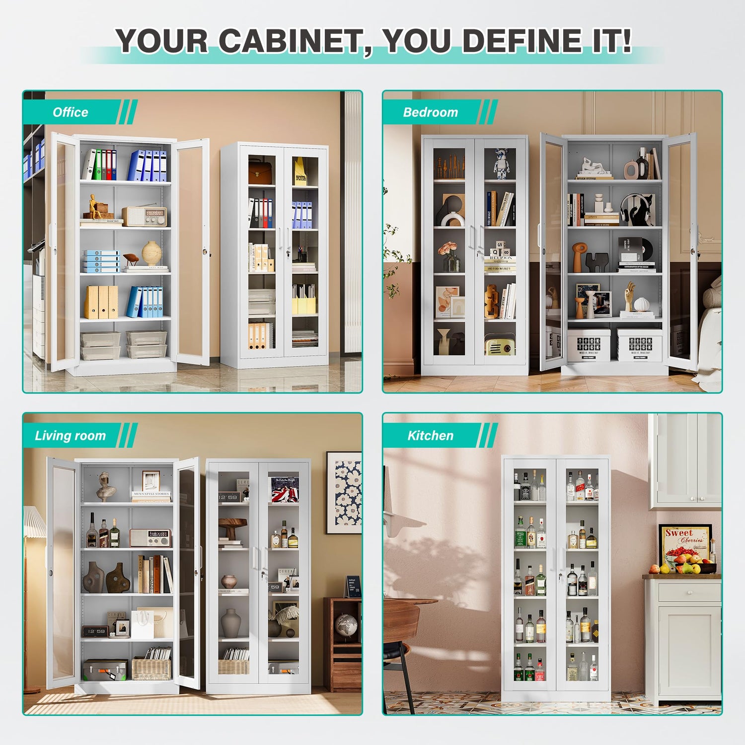 - 【Glass Door with Lock and Magnets】: Metal Display cabinet with doors and shelves have a lockable door with 2 keys and adopt a 3-point locking system, which allows you to store your valuables safely. This metal storage cabinet with doors and shelves can be used in the home, office, garage, warehouse, workshop, school, or anywhere you need additional storage.