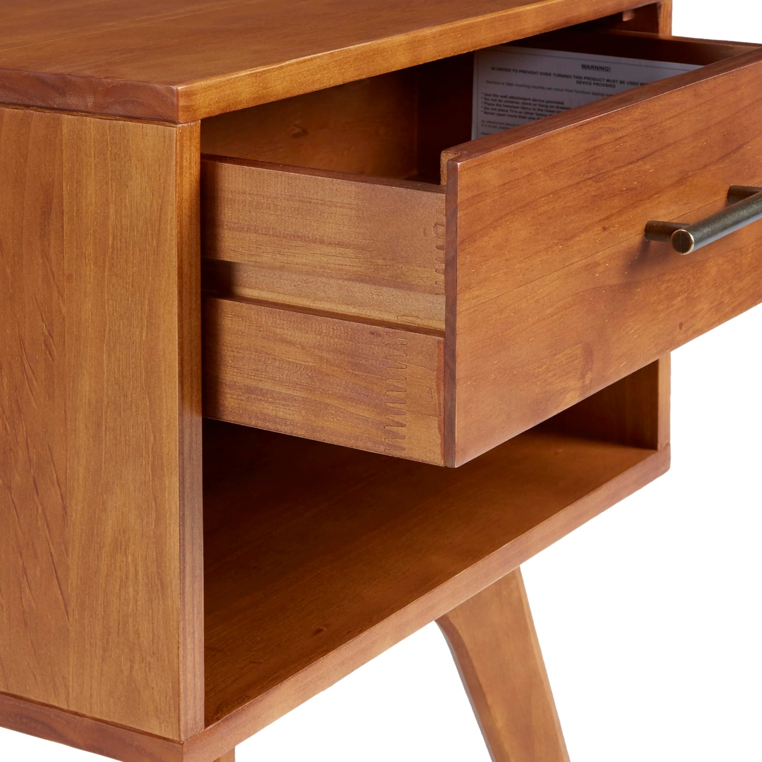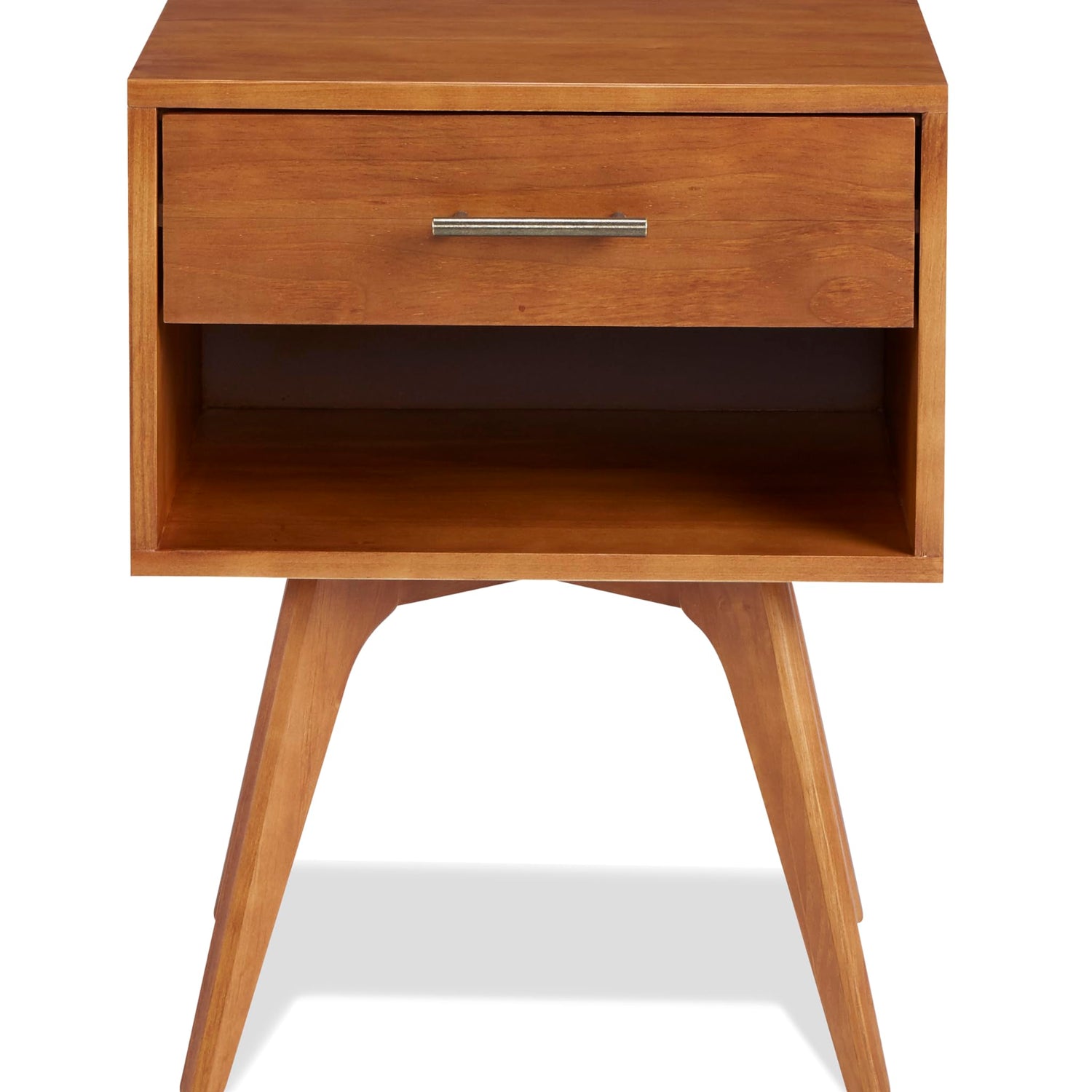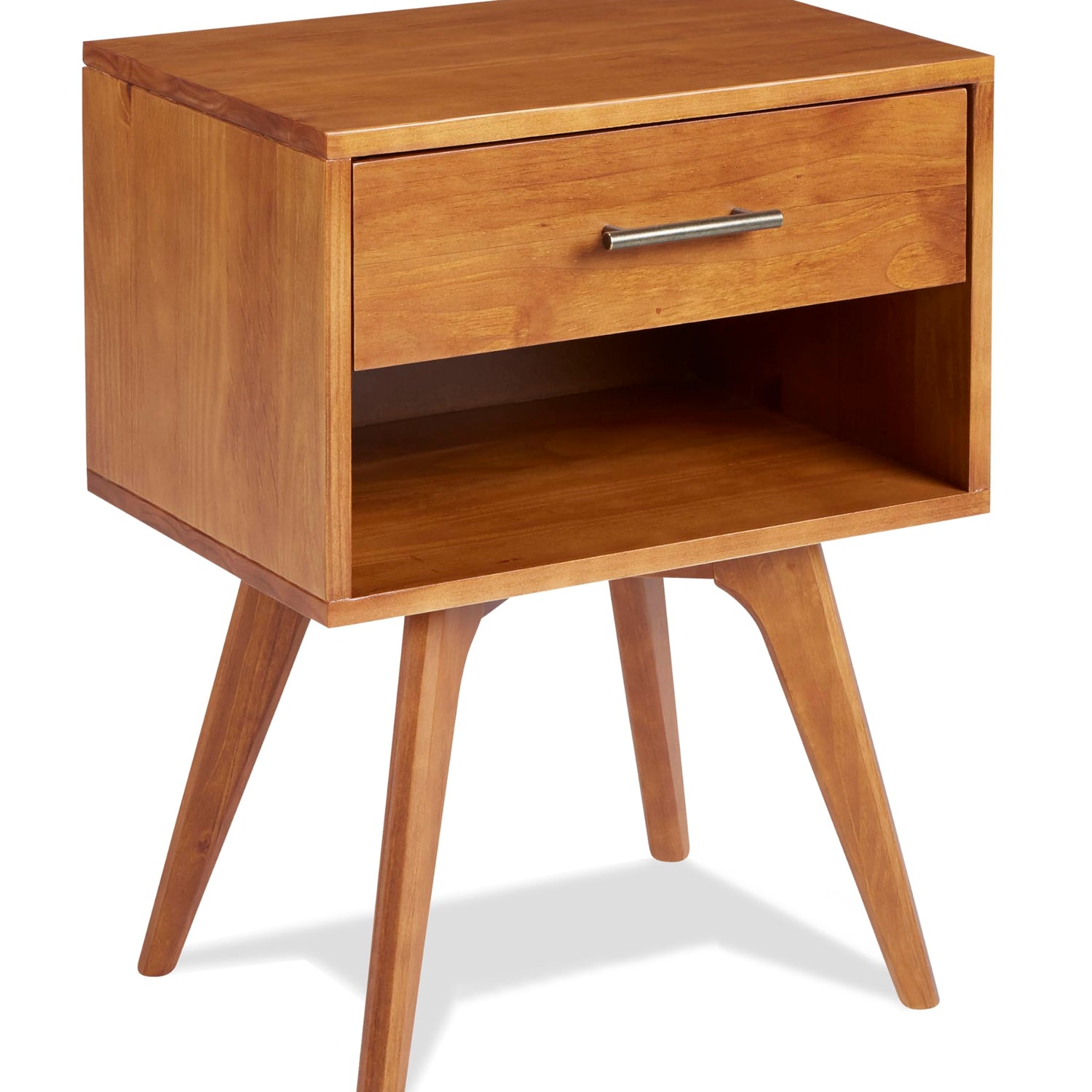 Details: Spruce up your bedroom with the addition of this Mid-Century Modern One Drawer Nightstand. Crafted primarily of 100% solid wood for a sturdy, sleek, and contemporary design, this piece is built to last. The nightstand features one drawer for compact bedside storage and a shelf below for easy access to your magazines and remote. The drawer is equipped with solid wood glides for smooth operation and long-lasting use. Thoughtfully constructed, it includes an MDF drawer bottom and back panel to ensure structural integrity while maintaining a clean, modern look. With its neat lines and geometric form, this piece epitomizes timeless simplicity you'll appreciate for years to come.