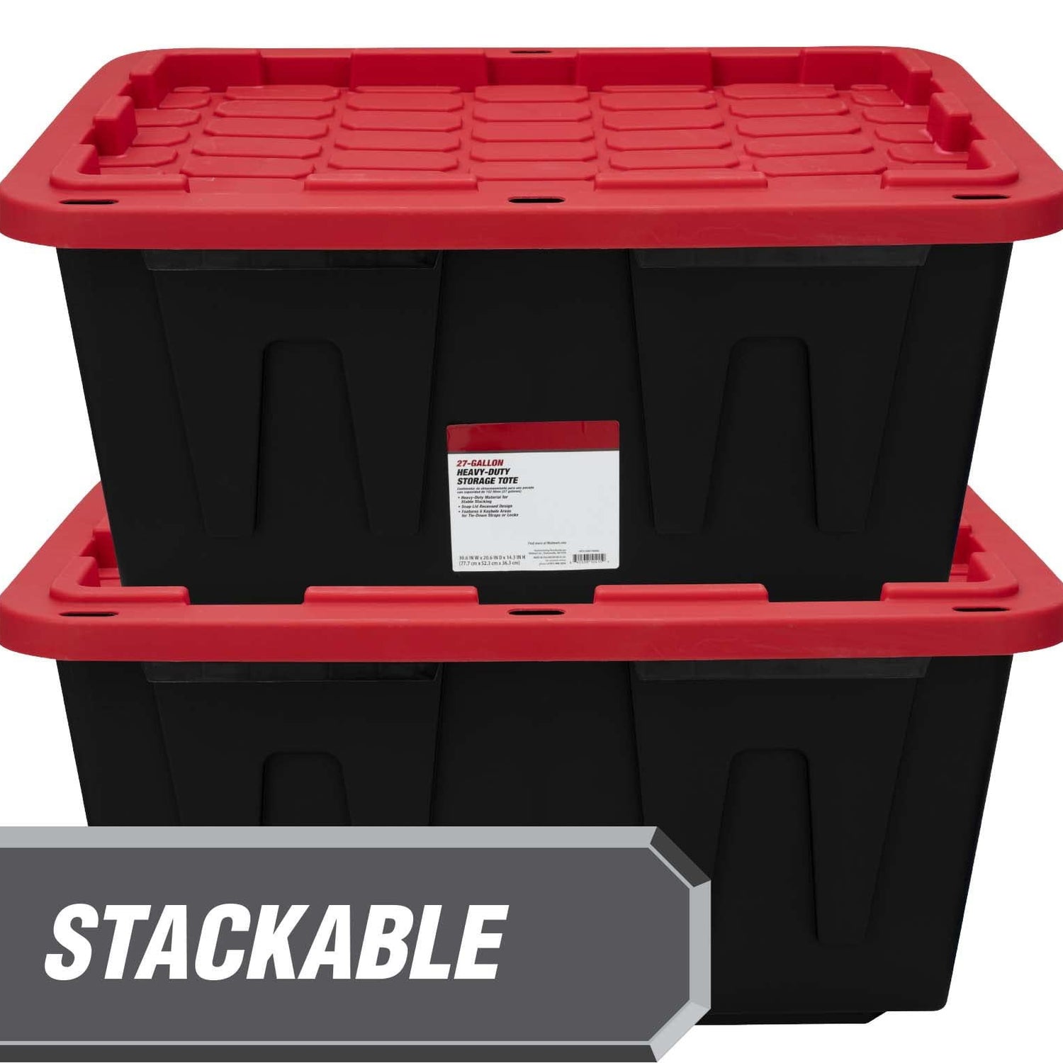 MioeDi 27 Gallon Stackable Snap Lid Plastic Storage Bin Container, Black with Red Lid, Set of 4, Black/Red
