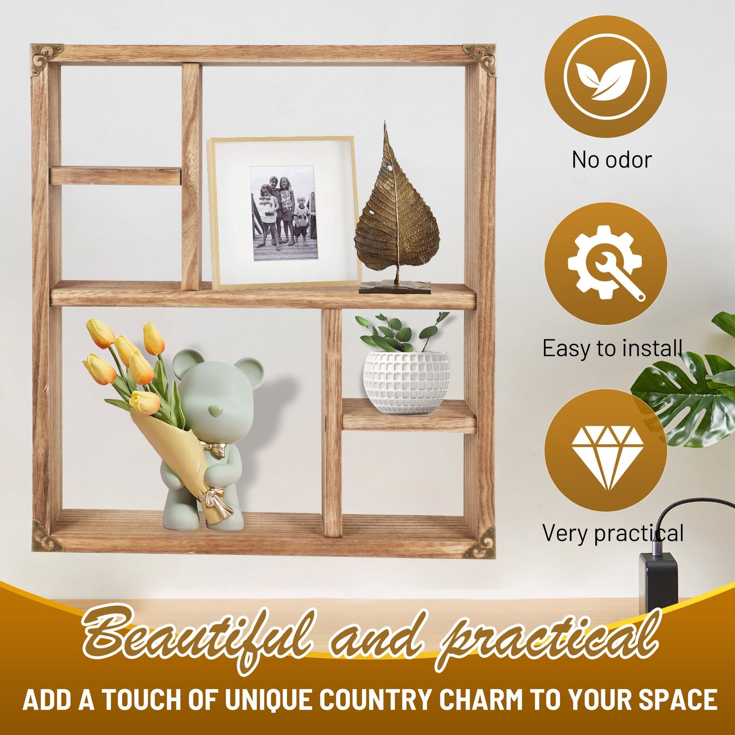 - 6 compartments storage:Wall mount shelves with 6 compartments, both large and small, allow for plentiful storage options for small personal and decorative items.We also come with four unique bronze corner guards that you can choose to install or not, if you choose to install, I believe it will make your eyes shine