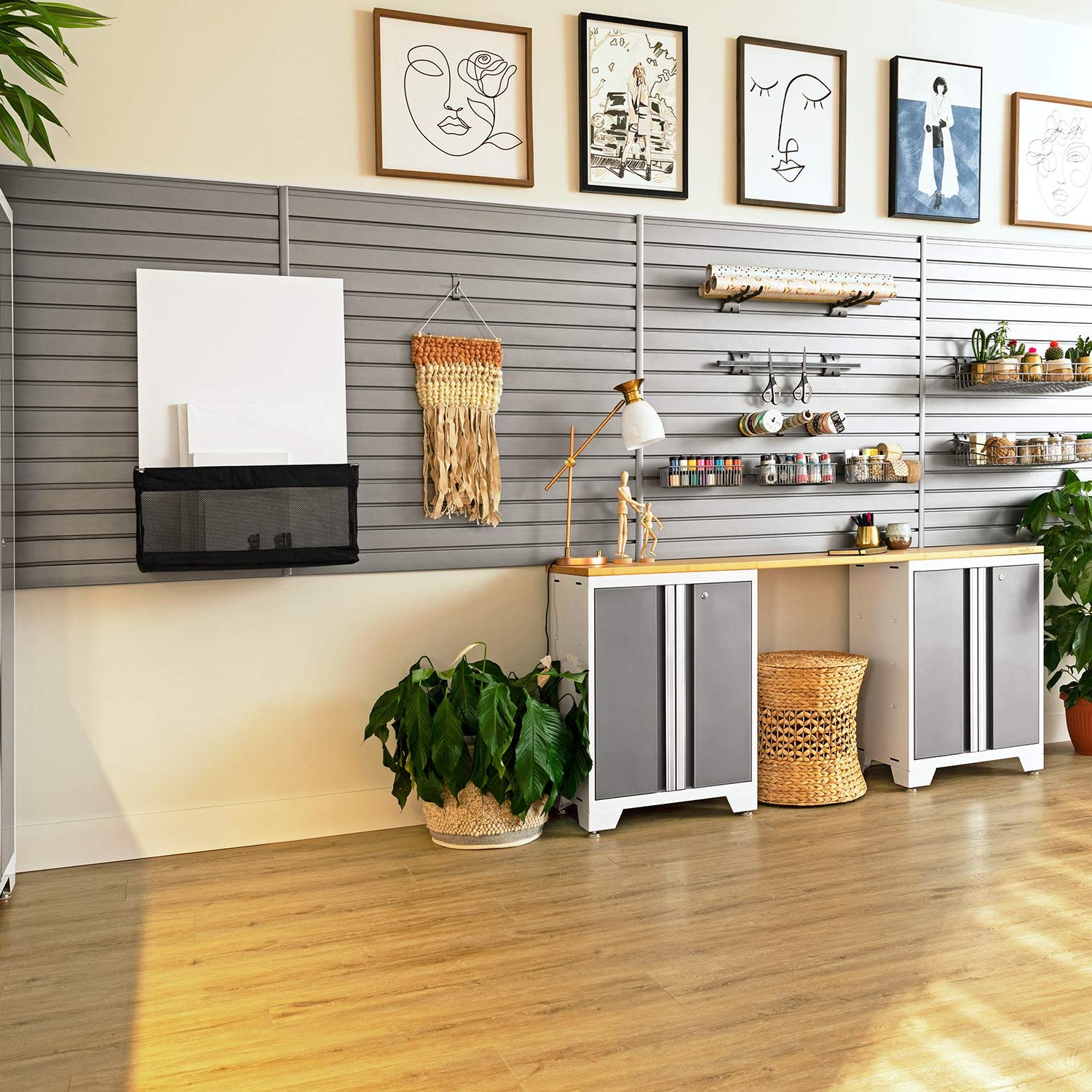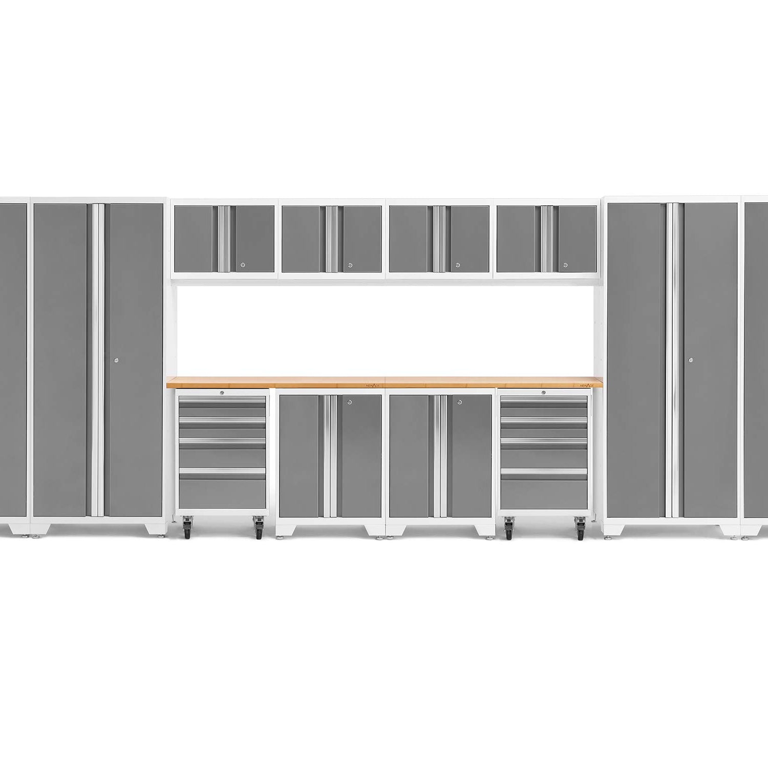 - Set Includes: 4 x Multi-Use Lockers, 4 x Wall Cabinets, 2 x Two-Door Base Cabinets, 2 x Rolling Tool Drawer Cabinets and 2 x 48 in. Bamboo Worktop