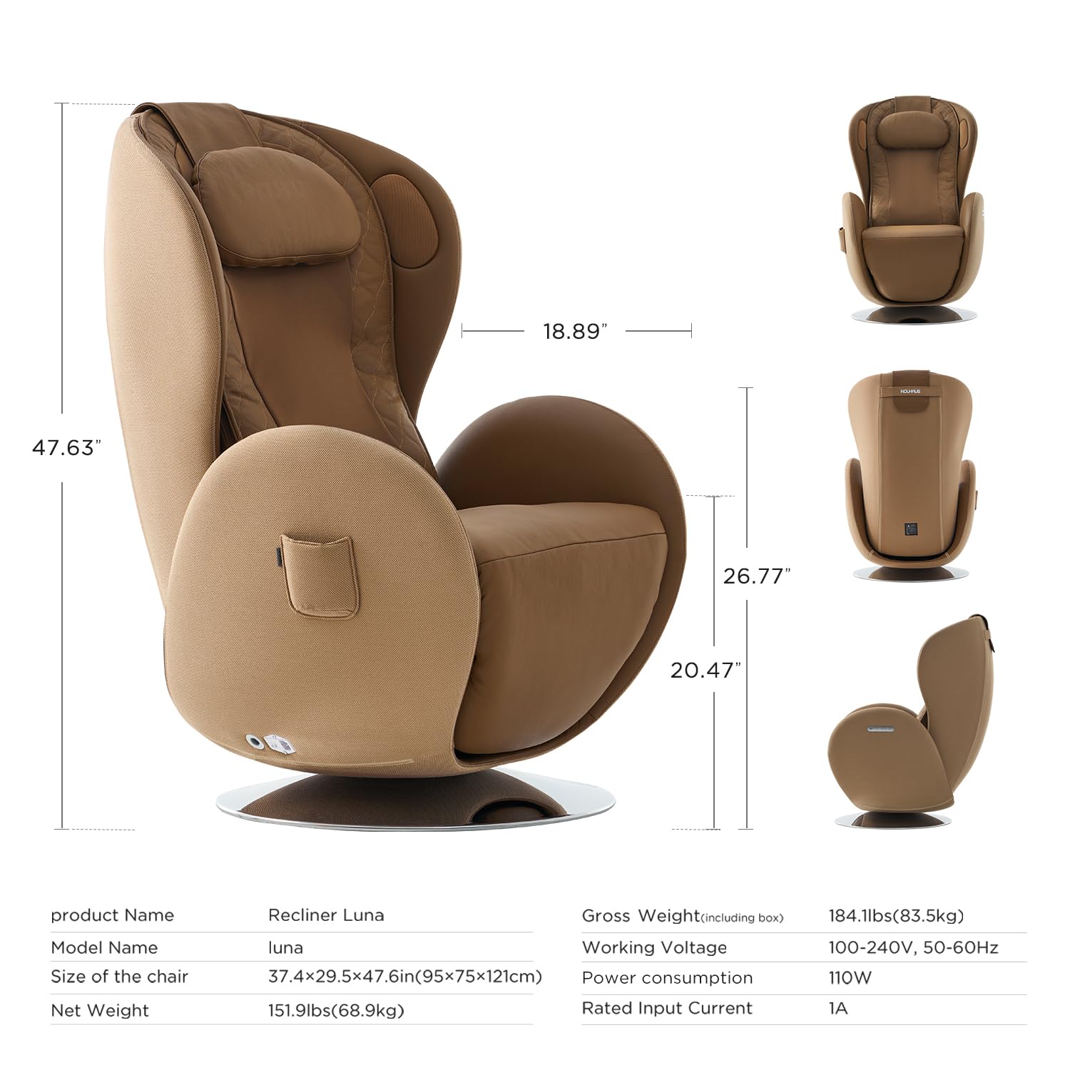 - 【Born to be a Massage Chair】: LUNA means "moon." Just as the moonlight illuminates the quiet midnight sky, LUNA is inspired by nature and embodies the inspiration and relaxation of the natural world. With personalized adjustable functions, relaxation is brought closer to our lives, offering personalized comfort to suit different body shapes and relaxation needs.