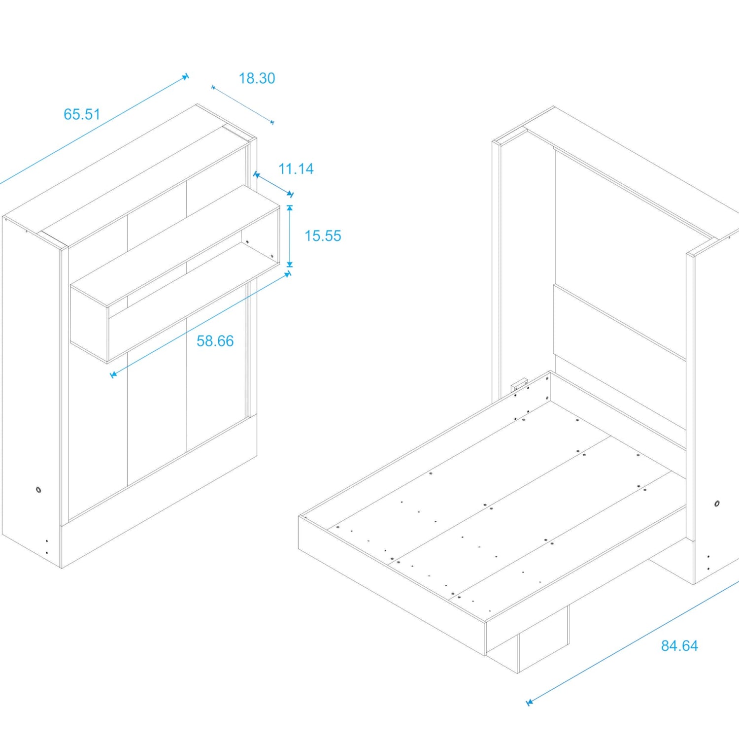 • QUEEN MURPHY BED OPEN DIMENSIONS: 84.7" L x 65.6" W x 90.6" H. BED CLOSED DIMENSIONS: 30.44" L x 65.6" W x 90.6" H. SHELF DIMENSIONS: 11.14" L x 58.66" W x 15.55". ASSEMBLED WEIGHT 235 LBS.