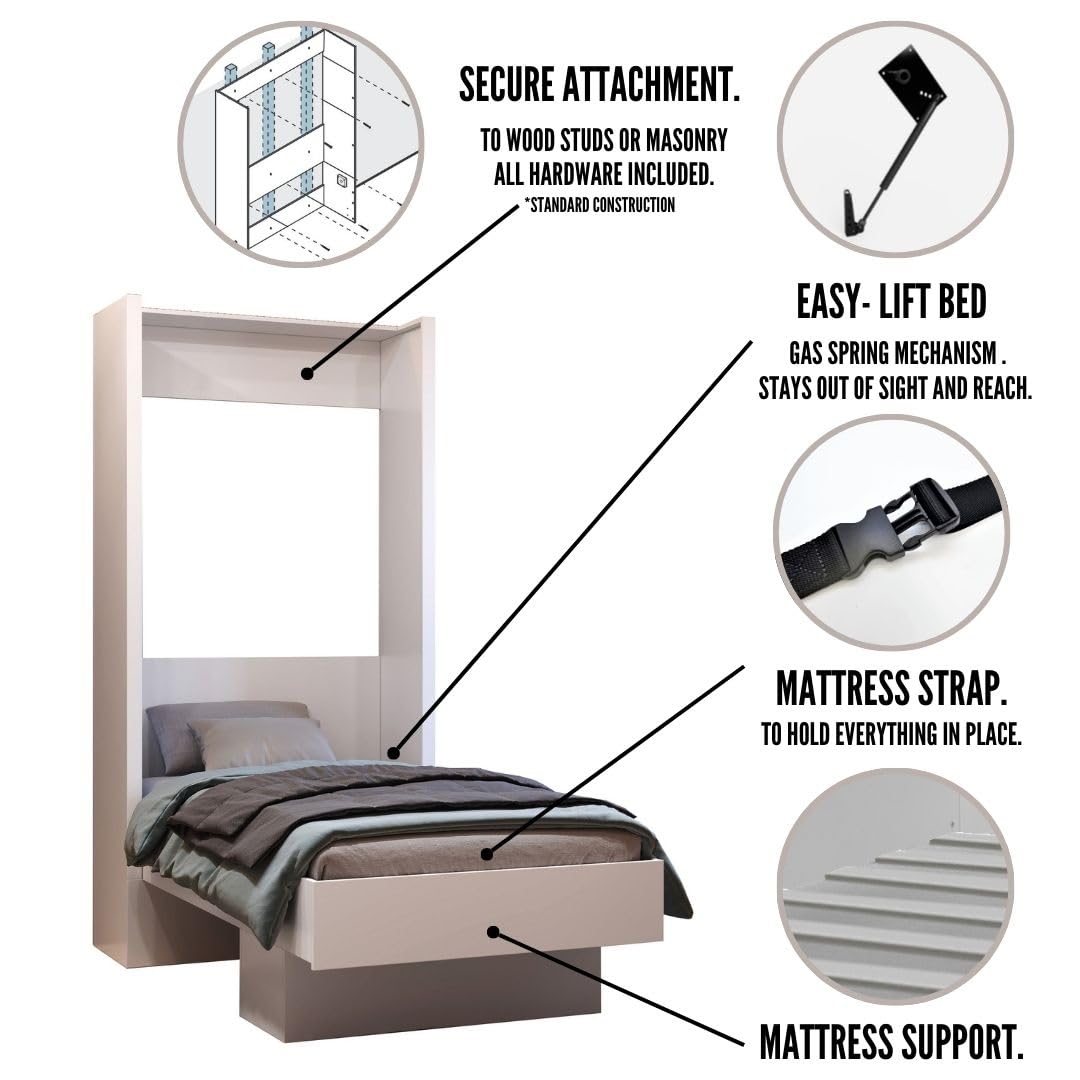 • WHAT IS INCLUDED: The twin murphy wall bed comes with locking pins, piston easy lift system, mattress secure strap, mounting hardware, and display shelf.