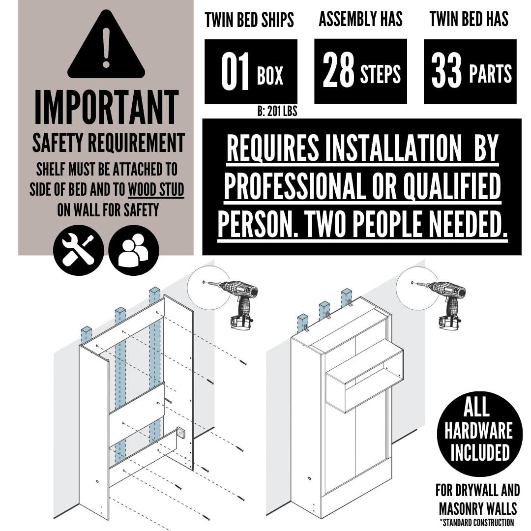 • INSTALLATION AND NOTES: To avoid risk of injury, bed must be installed to a wall structure by a professional or qualified person. Two people are required for assembly. Installation requires attachment to wood studs or masonry, removal of the baseboard, and drilling into the floor (if disassembly is required, holes may be covered with baseboards 0.5 inches or thicker). All necessary hardware is included. Do not use this product for children or pets under 50 pounds (22.7 kg).