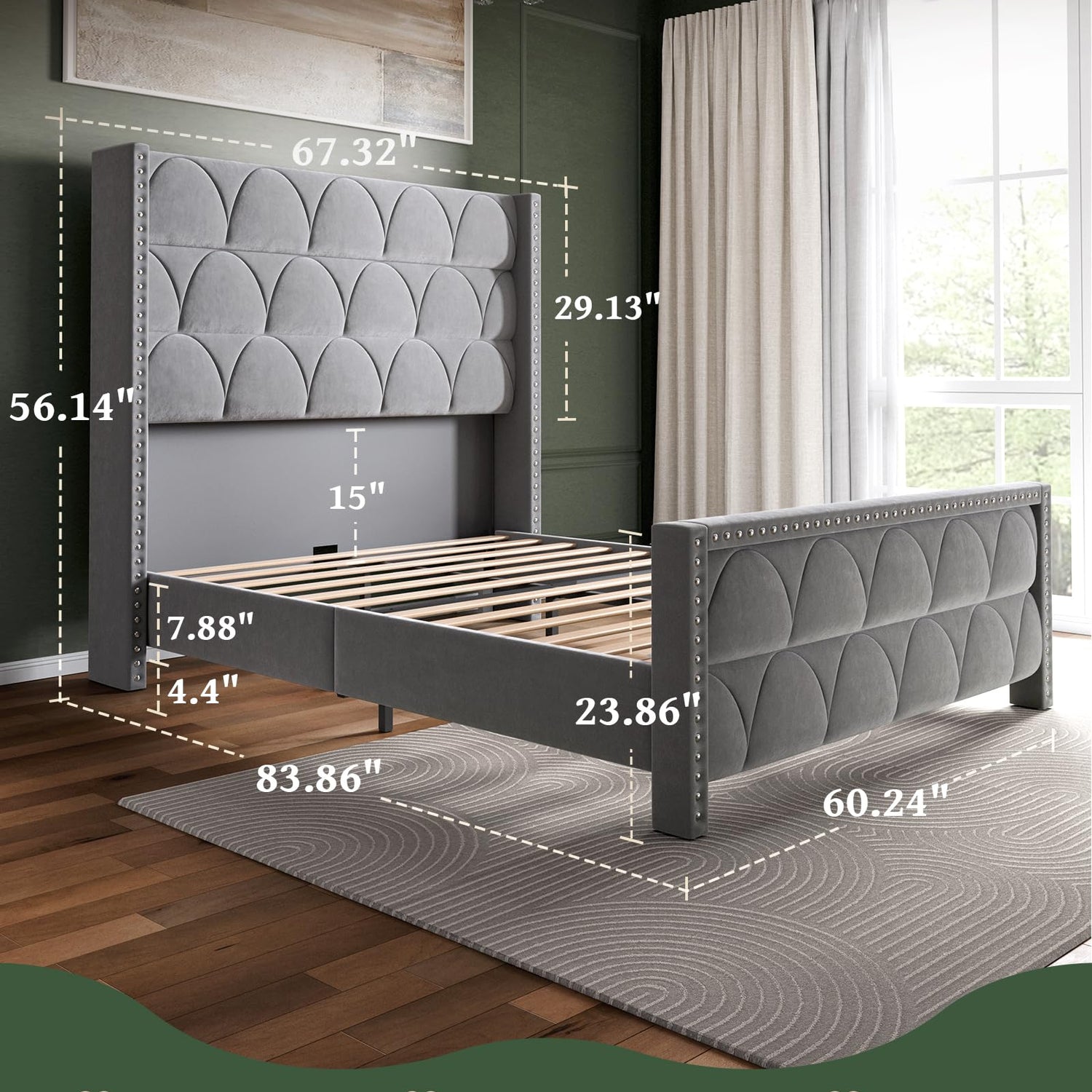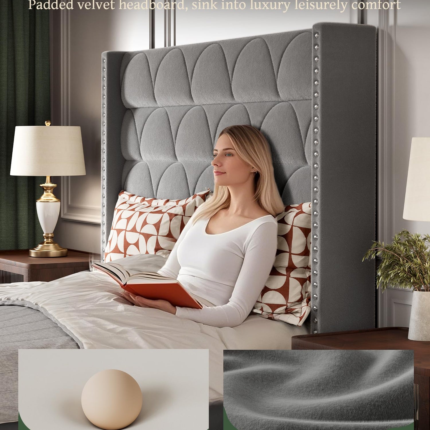 - ✅ 56" TALL WINGBACK HEADBOARD: Designed with style and comfort in mind, a towering 56" headboard,23.8" footboard for a grander look—larger than most on the market. Ample padding ensures soft yet supportive support while reading, working or watching TV in bed. Premium velvet finish is elegant, comfortable, and easy to clean