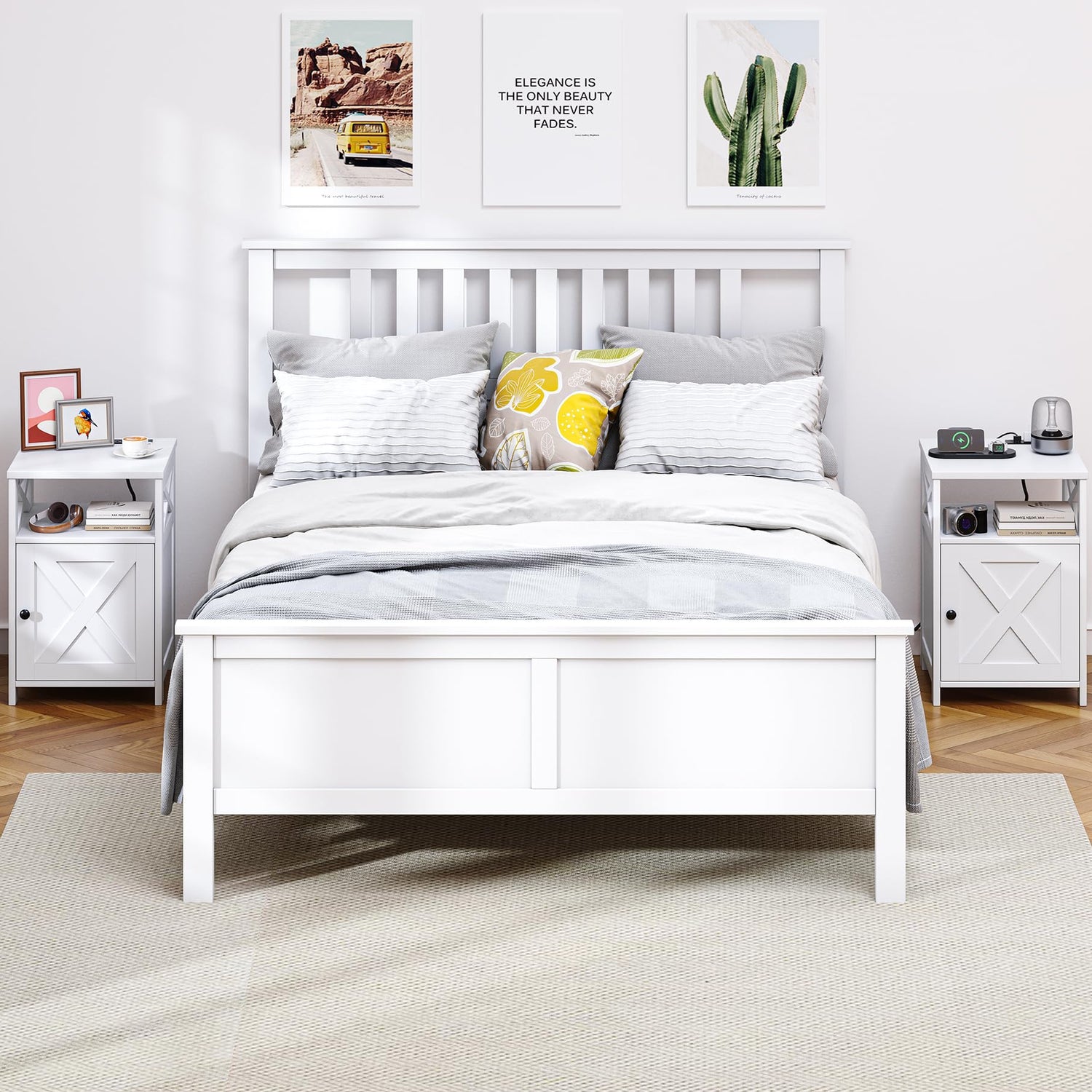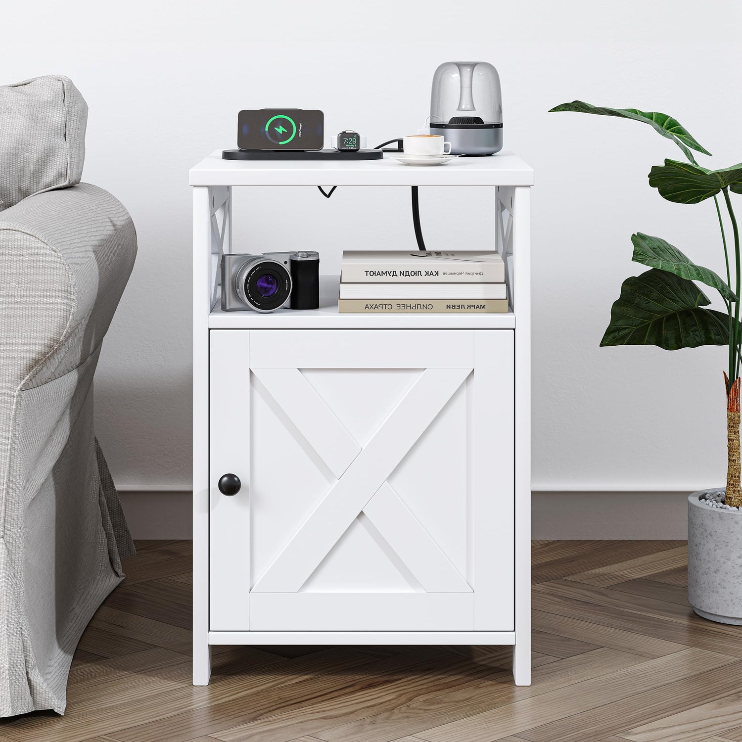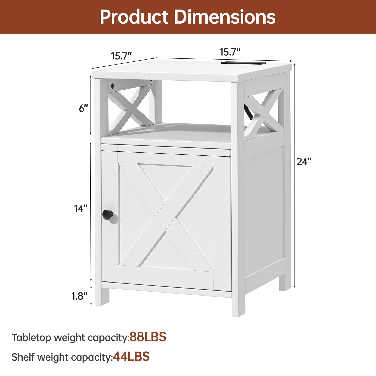 OtterOasis Farmhouse Nightstand with Charging Station and Barn Door, Bedside Table with Open Compartment and Storage, Side End Table for Bedroom, White