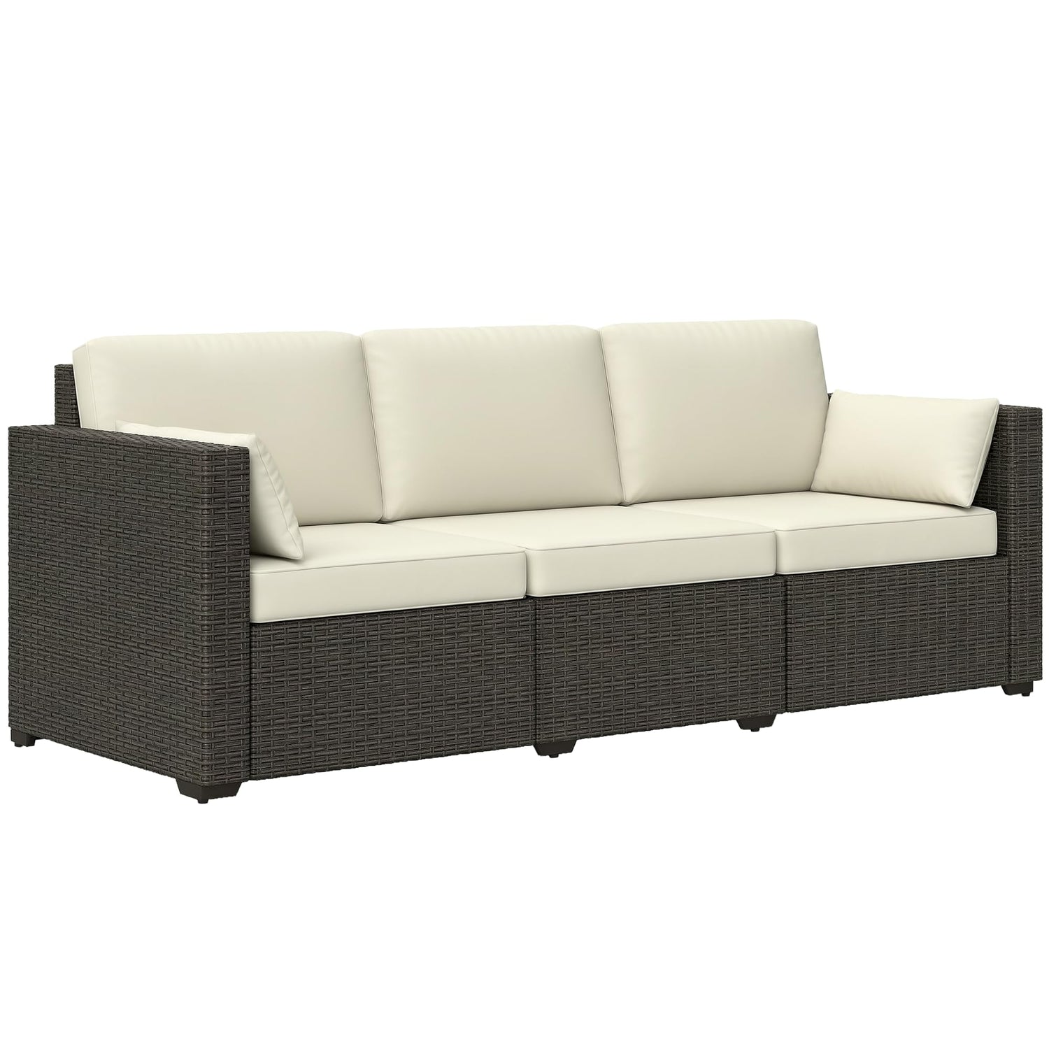 Outsunny Patio Couch PE Wicker Deep Seating Outdoor Sofa with Removable Cushions, 3 Seater Rattan Sofa, Outdoor Furniture for Balcony, Deck, Garden and Poolside, Cream White