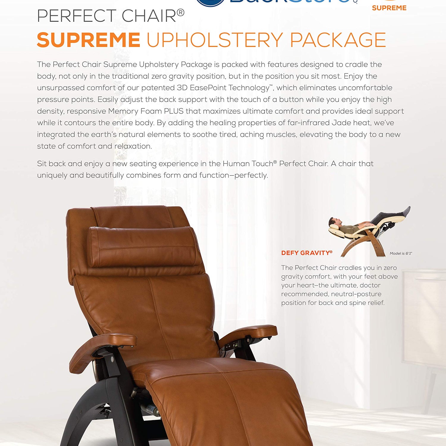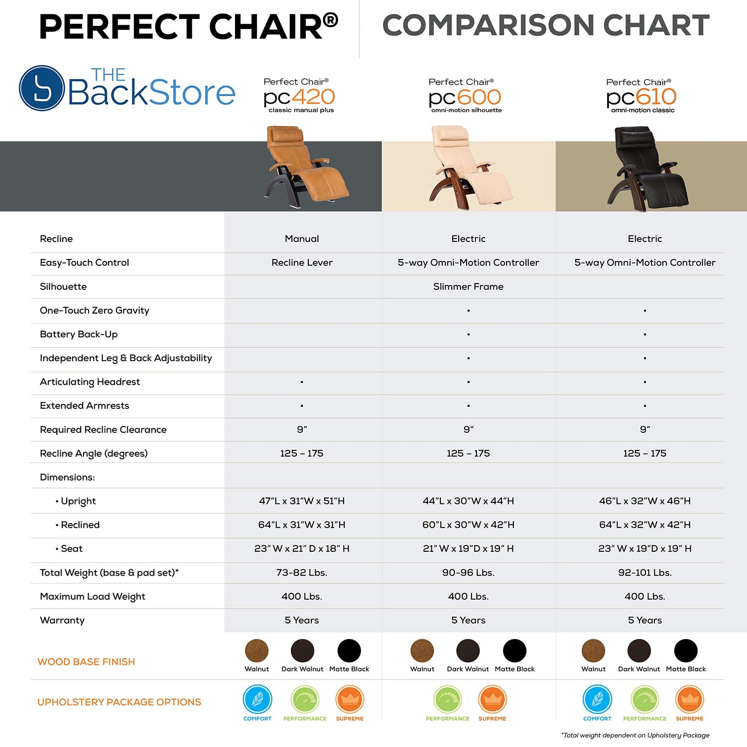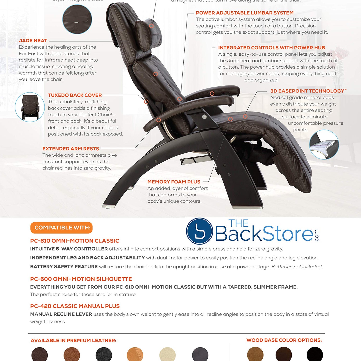 Details: Human Touch PC-610 Omni-Motion Classic Power Recline Walnut Wood Perfect Zero Anti Gravity Recliner Chair with Supreme Performance Package including Premium Leather, Jade Heat, Tuxedo Back Cover, Power Lumbar Support, 3D Easepoint Technology Seat Pad and Memory Foam - Human Touch PC-610 Omni-Motion Power Perfect Chair features longer armrests to support your arms even in the reclined position. The PC-610 uses smooth power recline to independently position your recline angle and leg elevation into infinite comfort positions, all at the touch of a button. Sleek ergonomic pad design with memory foam and Gel Seat. Full support head pillow with magnetic clasp. Power adjustable lumbar support system. Sculpted leg accents with integrated floor guides. High-tensile-strength steel body frame provides protection against rust and discoloration. Hand-carved and hand-stained 100 percent renewable solid parawood base. Zero gravity position cradles your back & elevates your legs above your heart - recommend by doctors as the healthiest way to sit. Patented Orthonomic body frame with built-in lumbar curve. Wide legrest provides maximum comfort. Hand carved & finished base is pleasing to the eye & constructed for years of use. Adjustable Articulating headrest feature allows you to customize the optimum angle of comfort to maximize neck support while reading or watching television. Exclusive guide rail system for smooth recline motion & position control. Upright Dims 43"L X 31"W X 47" High Reclined Dims 63"L X 31"W - Reclined Headrest Height 26" Reclined Footrest Height 31" - Seat Width 23" Gross weight (chair in box) 90 lbs, Maximum Weight 400 lbs Recline Clearance is 9", Recline Angle 125-175 Degrees Human Touch 5-Year Limited Warranty - 5 Year In-Home and 5 Year Parts Shipping Box Dimensions 42"L X 30"W X 27"H