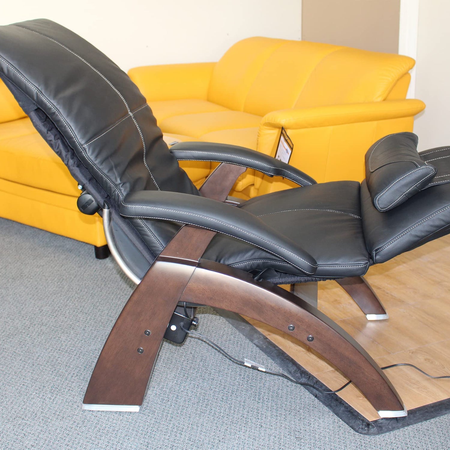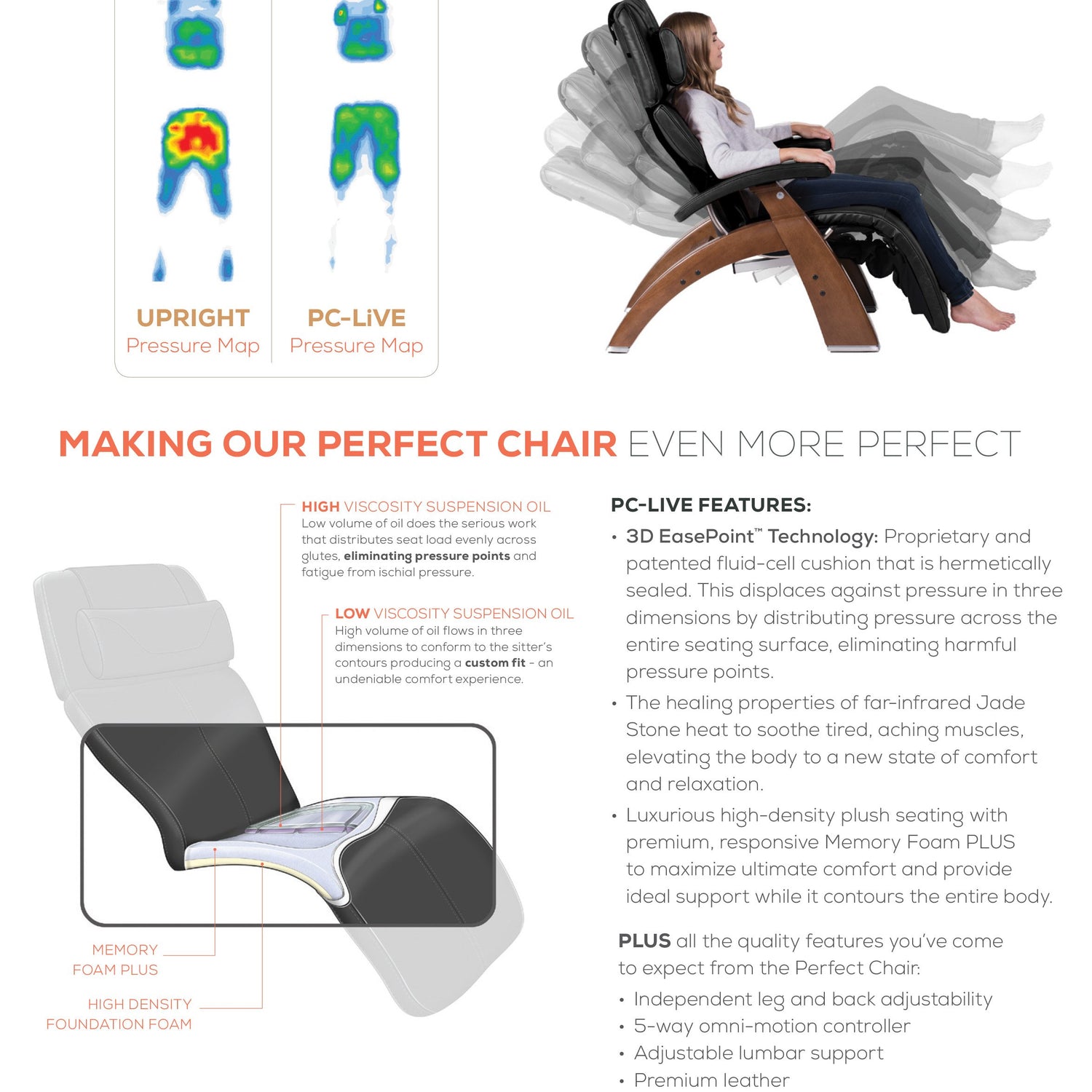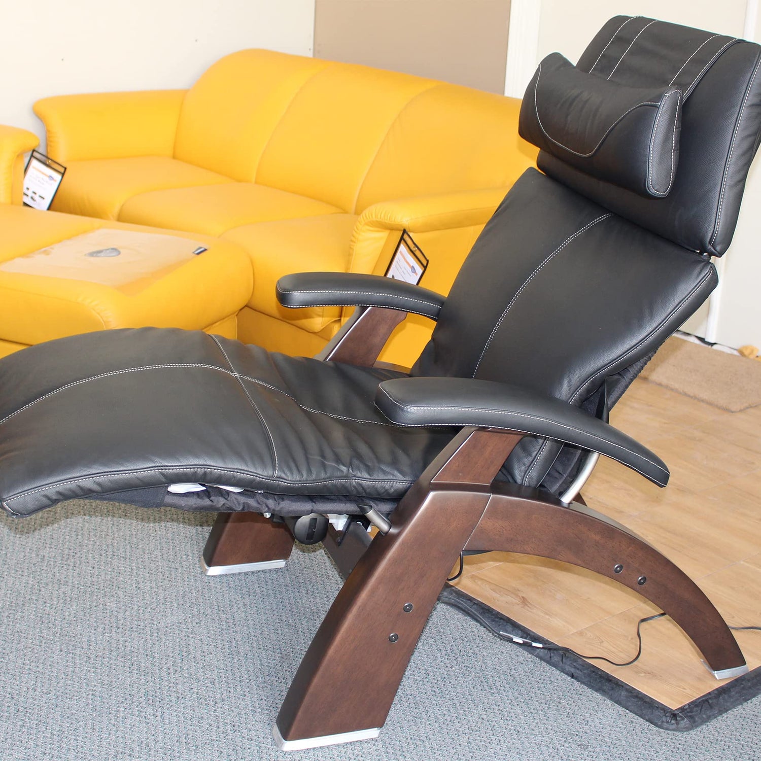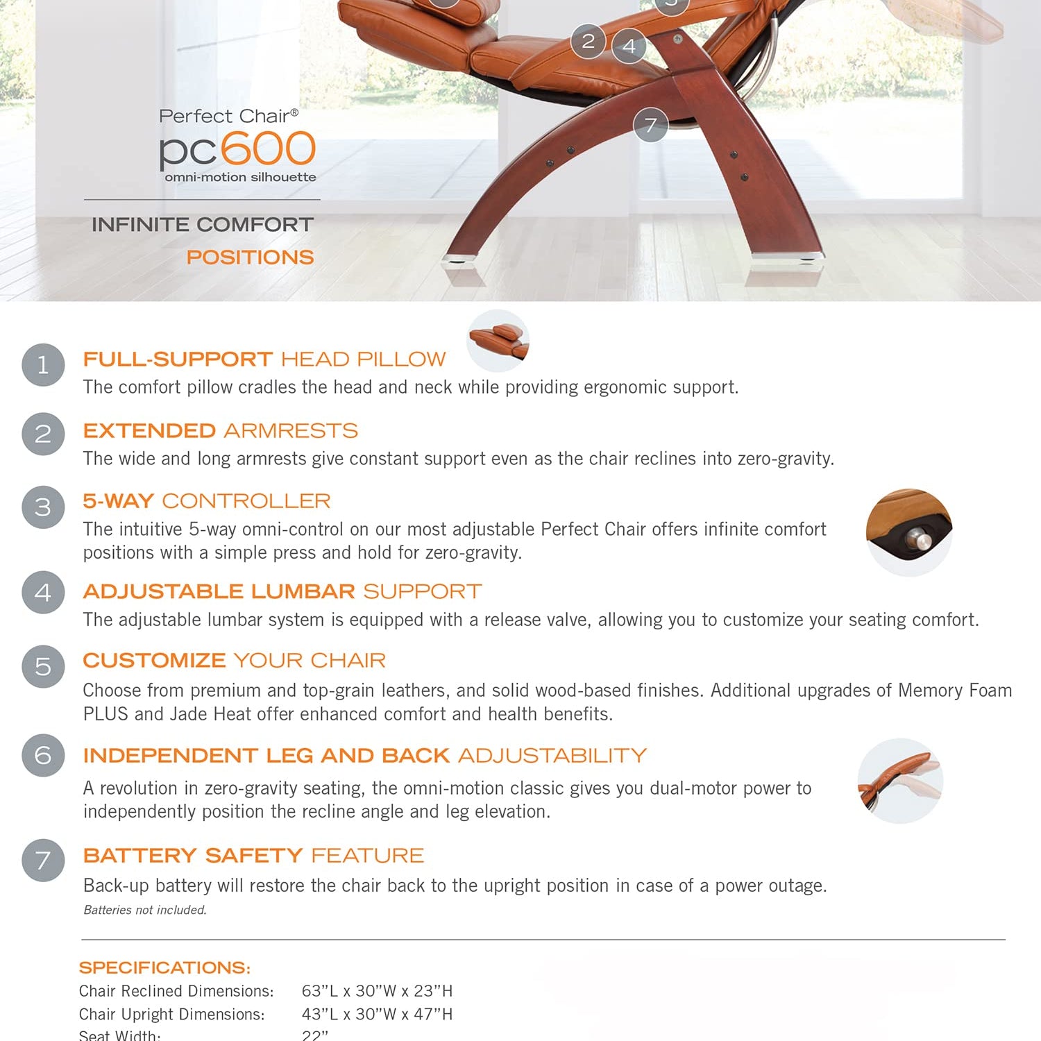 Details: The Perfect Chair Omni-Motion PC-600 power recline ergonomic Zero Gravity Leather Recliner with memory foam and heat by Human Touch - Package includes The Perfect Chair, Premium Leather pad set kit with Jade Heat, Memory Foam Plus and 3D EasePoint fluid-cell Seat Cushion. What makes our zero gravity recliners so perfect? We believe that zero gravity chairs are considered perfect only when they help their owners take better care of their posture, by allowing the spine to maintain a natural and relaxed position. While sitting in a fully-reclining chair, doctors recommend positioning your legs above your heart in order to increase lung capacity and relieve downward pressure on the spine. We carefully crafted our Human Touch zero gravity recliners to replicate this ideal seating position. Inspired by the zero gravity, or neutral posture, position used by NASA to support astronauts during their launch into orbit, we created our zero gravity recliners to naturally decompress the vertebrae and rejuvenate the spine to help ensure healthy sitting. Our zero gravity chairs are also made from luxurious yet durable materials, including premium leather upholstery. Choosing our ergonomically designed chair for work or relaxation can proactively take care of your health and comfort so that you can feel your best every day. Independent leg and back adjustability. 5-way omni-motion controller, Manual adjustable lumber support, premium leather and a Hand-Carver solid wood base. Human Touch 7 Year Limited Parts and Labor Warranty. Approximate Dimensions: Upright Chair Dimensions: 44" L x 30"W x 44" H, Reclined: 60" L x 30"W x 42" H, Seat Dimensions: 21" W x 19"D x 19" H, Maximum Weight Capacity: 400lbs