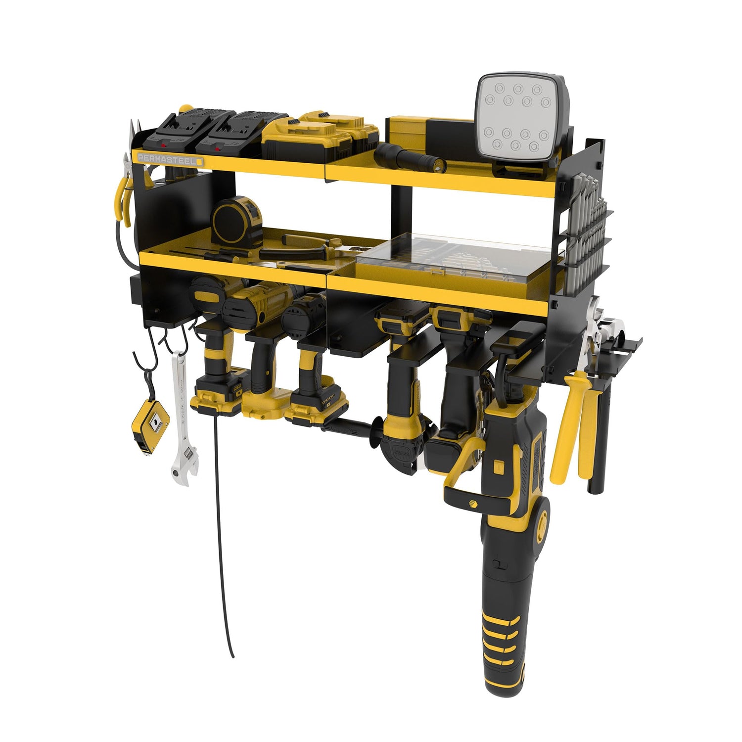 Permasteel Power Tool Organizer Wall Mount - 150 Lbs Load 3-Layer Heavy Duty Metal Storage Rack with Charging Station, Holds 6 Drills, 9 Hand Tools and 16 drill bits for Garage and Workshop, Yellow