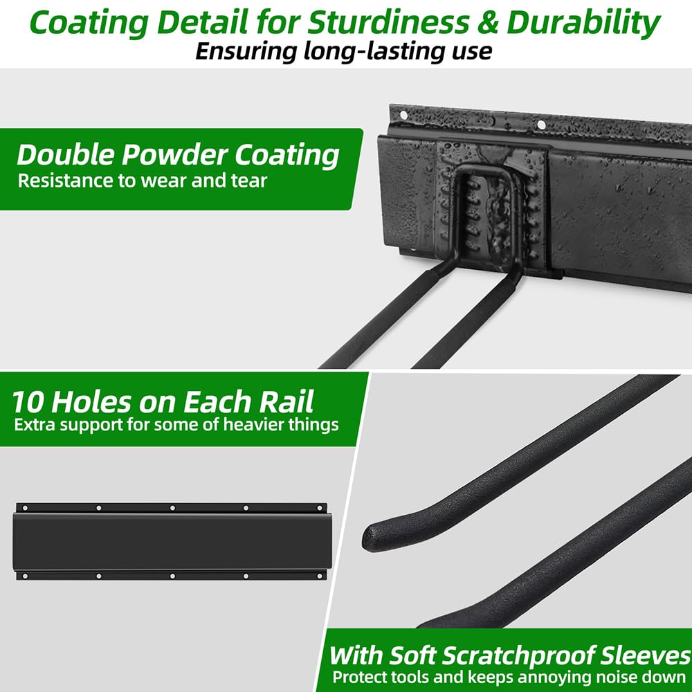 - Space-Saving Design: The hooks have a nice soft coating that will protect tools keeps any rattle or annoying noise down with you place thing on or take things off the rack. Tool rack Utilizes unused wall space, helping keep garage tidy and clutter-free