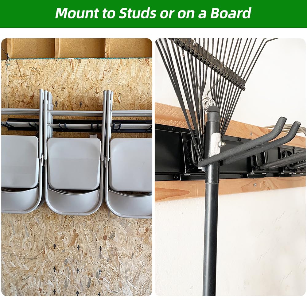 - Versatile Functionality: The garage organization is equipped with six adjustable hooks and three rails. Every rail is engineered to fit the standard 16-inch on-center stud spacing, perfect for garages, sheds, and workshops in need of robust organization