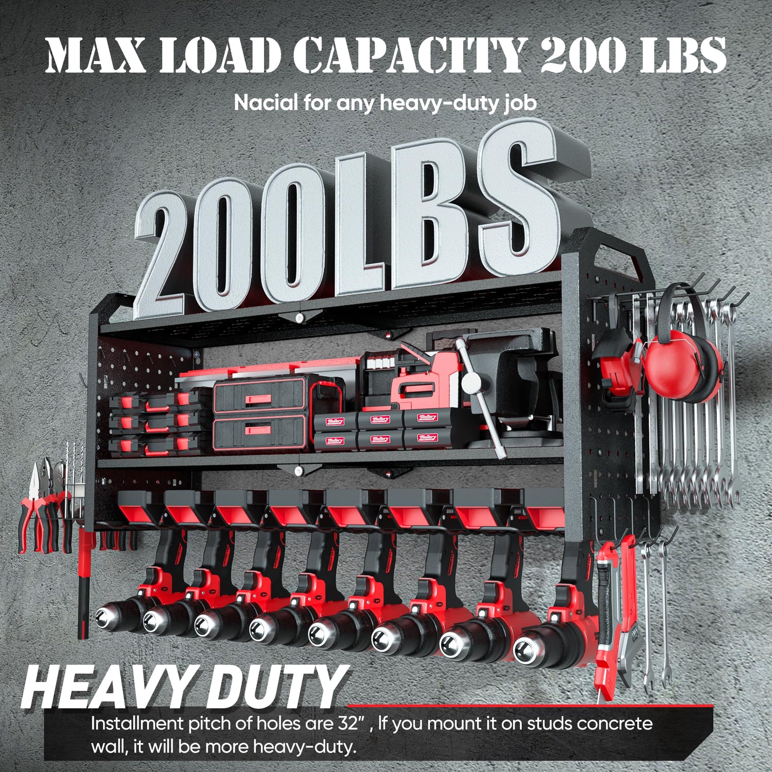 - Max Load Capacity 200 Lbs: Nacial power tool organizer wall mount with charging station crafted from 100% premium heavy-duty solid steel, shaped through over 20 precision steps and strengthened at high temperatures for 4 hours for 200 lbs superior load capacity [Max stability when mounted on standard 16", concrete or solid wal!] With our drill holder wall mount, your tools will always stay securely in place, ready for any task